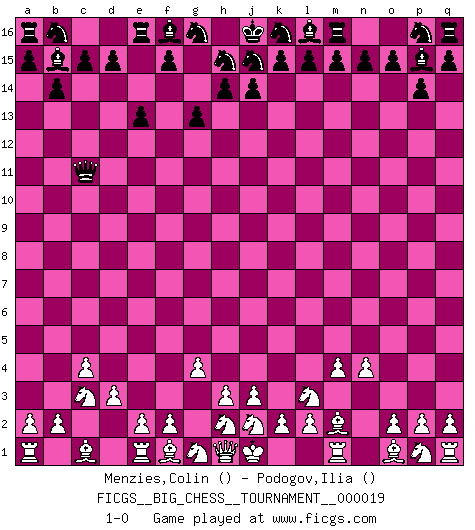 Last move : 1-0 2008 May 1 9:0:51 [Event "FICGS__BIG_CHESS__TOURNAMENT__000019"] [Site "FICGS"] [Date "2008.03.17"] [Round "1"] [White "Menzies,Colin"] [Black "Podogov,Ilia"] [Result "1-0"] [WhiteElo ""] [BlackElo ""] 1.k1-l3 g15-g13 2.g2-g4 h16-c11 3.d2-d3 b15-b14 4.n2-n4 c16-b15 5.m2-m4 p15-p14 6.c2-c4 o16-p15 7.b1-c3 e15-e13 8.l1-m2 1-0 This big chess game has been lost on time (started : 2008.03.17 3:4:58) Follow this game move after move (download)Adequate compensation for a sacrifice is having a sound combination leading to a winning position; adequate compensation for a blunder is having your opponent snatch defeat from the jaws of victory. (Bruce A. Moon) Es liegt in der Natur, vernüftig zu denken und unlogisch zu handeln. (Anatole France) Los Peones son nacidos libres, y aún así, se encuentran por doquier encadenados. (Rick Kennedy) Tout change constamment, y compris dans le monde des Echecs. (Botvinnik) Excelling at chess has long been considered a symbol of more general intelligence. That is an incorrect assumption in my view, as pleasant as it might be. But for the purposes of argument and investigation, chess is, in Russkin-Gutman's words, 'an unparalleled laboratory, since both the learning process and the degree of ability obtained can be objectified and quantified, providing an excellent comparative framework on which to use rigorous analytical techniques.' (The Chess Master and the Computer, by Garry Kasparov - 2010)
