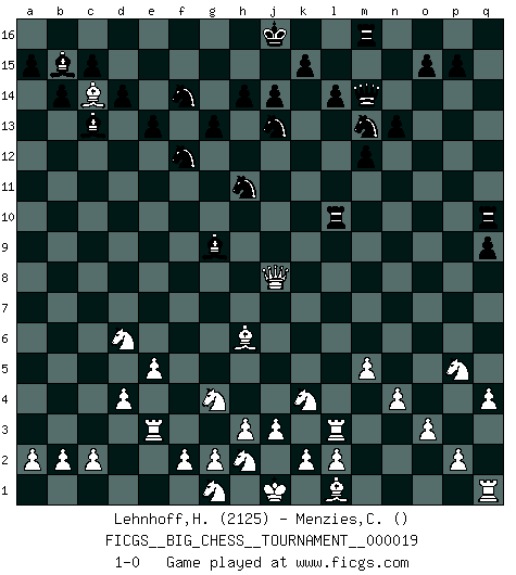 Last move : 1-0 2008 June 4 22:14:22 [Event "FICGS__BIG_CHESS__TOURNAMENT__000019"] [Site "FICGS"] [Date "2008.03.17"] [Round "1"] [White "Lehnhoff,Heinz-Georg"] [Black "Menzies,Colin"] [Result "1-0"] [WhiteElo "2125"] [BlackElo ""] 1.h2-g4 b15-b14 2.j2-k4 c16-b15 3.h1-o7 p16-o14 4.o7-f15 b16-c14 5.f15-f12 d15-d14 6.m2-m4 g15-g13 7.f12-f10 h15-j13 8.e2-e4 f16-g15 9.d2-d4 g15-d12 10.f10-c10 j15-g14 11.o2-o3 k16-h15 12.n2-n4 n15-n13 13.p1-q3 e15-e13 14.b1-a3 e16-f16 15.c1-h6 f16-f10 16.c10-c4 m15-m13 17.e1-e3 o16-g9 18.m4-m5 l16-n14 19.e3-f3 a16-f16 20.a1-e1 m13-m12 21.o1-g8 n14-m13 22.e4-e5 h16-l13 23.k1-h2 f10-p10 24.q3-p5 j13-h11 25.f3-f16 g14-f16 26.f1-d3 f16-g14 27.d3-f5 q15-q13 28.f5-e6 q13-q12 29.m1-m3 l13-m14 30.e1-e3 g16-f14 31.q2-q4 g14-f12 32.e6-f7 q12-q11 33.g8-m13 o14-m13 34.f7-a12 d12-c13 35.m3-l3 l15-l14 36.a3-b5 q11-q10 37.b5-d6 q10-q9 38.c4-l12 h15-j13 39.l12-l6 q16-q10 40.a12-c14 p10-l10 41.l6-j8 1-0 Follow this game move after move (download)A thorough understanding of the typical mating continuations makes the most complicated sacrificial combinations leading up to them not only not difficult, but almost a matter of course. (Siegbert Tarrasch) Zu meiner Zeit war ein 20 jähriger ein junger Spieler, heute ist er ein Veteran. (Garry Kasparov) Si pudieramos observar el interior de la cabeza de un jugador de Ajedrez, encontraríamos ahí un mundo lleno de sentimientos, imágenes, ideas, emoción y pasión. (Alfred Binet) Votre seul travail dans les ouvertures est d'obtenir un milieu de partie jouable. (Lajos Portish) Macintosh - we might not get everything right, but at least we knew the century was going to end. (Douglas Adams)