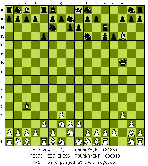 Last move : 0-1 2008 April 23 13:40:7 [Event "FICGS__BIG_CHESS__TOURNAMENT__000019"] [Site "FICGS"] [Date "2008.03.17"] [Round "1"] [White "Podogov,Ilia"] [Black "Lehnhoff,Heinz-Georg"] [Result "0-1"] [WhiteElo ""] [BlackElo "2125"] 1.g2-g4 j15-k13 2.h1-d5 m15-m13 3.p2-p3 e15-e13 4.o1-p2 h16-o10 5.d5-f5 g16-f14 6.o2-o4 l16-o13 7.f5-c5 n15-n13 8.j2-g3 o16-c5 9.e2-e3 m16-m14 0-1 Follow this game move after move (download)Many have become Chess Masters, no one has become the Master of Chess. (Siegbert Tarrasch) Die Idee von Capablanca, Schach als Fach in den Schulen zu lehren, ist großartig. (Fidel Castro) En la perfecta combinación de Ajedrez como en una historia corta de primera clase, toda la trama y contra trama deberá conducir hacia un final sorprendente, el interes no es mitigado hasta el último momento. (Yates and Winter) Les échecs c'est le défi de l'alpiniste, toujours plus haut, prêt à tout pour monter à l'assaut du Roi ennemi. Les échecs, c'est de la musique en mouvement, un ballet majestueux pour les yeux. C'est de la poésie composée par les fantômes du passé qui au même titre que Rimbaud ou Verlaine méritent notre admiration. Les échecs, c'est de la peinture ou le moindre mouvement modifie le tableau pour en faire un Picasso ou un Van Gogh. Les échecs, c'est tout et rien, c'est la vie et la mort. Jjulie33 sur le forum de France-Echecs. When you don't know what to do, walk fast and look worried. (Anonymous)