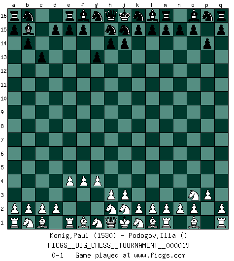 Last move : 0-1 2008 May 22 10:26:52 [Event "FICGS__BIG_CHESS__TOURNAMENT__000019"] [Site "FICGS"] [Date "2008.03.17"] [Round "1"] [White "Konig,Paul"] [Black "Podogov,Ilia"] [Result "0-1"] [WhiteElo "1530"] [BlackElo ""] 1.g2-g4 c15-c13 2.f2-f4 g15-g13 3.e2-e4 b15-b14 4.p1-o3 c16-b15 5.p2-p3 p15-p14 0-1 This big chess game has been lost on time (started : 2008.03.17 3:4:58) Follow this game move after move (download)An attack on the wing should be met by play in the center. (Nimzovitch) Je mehr wir mit Computern analysieren, desto mehr glauben wir an Verteidigung. (Vladimir Kramnik) Bobby Fischer es el mas grande genio de Ajedrez de todos los tiempos. (Alexander Kotov) C'est la seule position que je connaisse où les deux camps sont mals. Propos prêtés à V. Anand. For peace of mind, resign as general manager of the universe. (Douglas Adams)