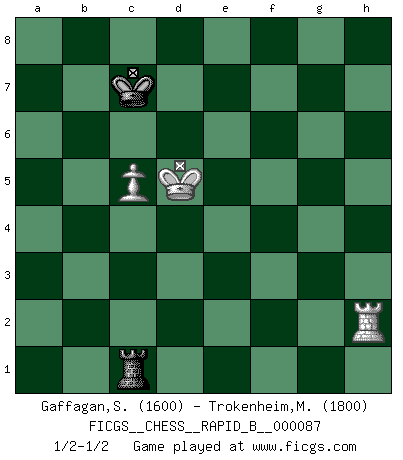 Last move : 1/2-1/2 2008 July 16 9:56:54 [Event "FICGS__CHESS__RAPID_B__000087"] [Site "FICGS"] [Date "2008.03.17"] [Round "1"] [White "Gaffagan,Steven"] [Black "Trokenheim,Marek"] [Result "1/2-1/2"] [WhiteElo "1600"] [BlackElo "1800"] 1.e4 e5 2.Nf3 Nc6 3.Bb5 a6 4.Ba4 Nf6 5.O-O Be7 6.Re1 b5 7.Bb3 d6 8.c3 O-O 9.h3 Na5 10.Bc2 c5 11.d4 h6 12.dxe5 dxe5 13.Qxd8 Bxd8 14.Nxe5 Bb7 15.f3 c4 16.Be3 Bc7 17.Ng4 Nxg4 18.hxg4 Nc6 19.f4 Rad8 20.a4 b4 21.Nd2 Bc8 22.Nxc4 Bxg4 23.a5 bxc3 24.bxc3 Be6 25.Nb6 f5 26.Nd5 Bxa5 27.Ne7+ Nxe7 28.Rxa5 Bc4 29.Re5 Rf7 30.exf5 Nd5 31.Rd1 R7f8 32.Kf2 Nxe3 33.Kxe3 Rxd1 34.Bxd1 Rc8 35.Kd4 Rd8+ 36.Kxc4 Rxd1 37.Kc5 Rg1 38.c4 Rxg2 39.Kb6 h5 40.c5 h4 41.Re8+ Kf7 42.Rh8 Rb2+ 43.Kxa6 Ke7 44.f6+ gxf6 45.Rh7+ Kd8 46.Rf7 h3 47.Rxf6 h2 48.Rh6 Kc7 49.f5 Kd7 50.Ka5 Kc7 51.f6 Ra2+ 52.Kb5 Rb2+ 53.Kc4 Kd7 54.f7 Rc2+ 55.Kd4 Rf2 56.Kd5 Rxf7 57.Rxh2 Rf5+ 58.Kc4 Rf1 59.Rb2 Kc8 60.Kb5 Kc7 61.Rb4 Ra1 62.Rb2 Rf1 63.Rh2 Rb1+ 64.Kc4 Rc1+ 65.Kd5 1/2-1/2 Ruy Lopez : Closed Kingside Castling by player White (move 5) Kingside Castling by player Black (move 8) 10 pieces endgame at move 38 : White KRPPP , Black KRPPP WHITE : King + 1 Rook 3 Pawns BLACK : King + 1 Rook 3 Pawns 9 pieces endgame at move 43 : White KRPPP , Black KRPP WHITE : King + 1 Rook 3 Pawns BLACK : King + 1 Rook 2 Pawns 8 pieces endgame at move 44 : White KRPP , Black KRPP WHITE : King + 1 Rook 2 Pawns BLACK : King + 1 Rook 2 Pawns 7 pieces endgame at move 47 : White KRPP , Black KRP WHITE : King + 1 Rook 2 Pawns BLACK : King + 1 Rook 1 Pawn 6 pieces endgame at move 56 : White KRP , Black KRP WHITE : King + 1 Rook 1 Pawn BLACK : King + 1 Rook 1 Pawn 5 pieces endgame at move 57 : White KRP , Black KR WHITE : King + 1 Rook 1 Pawn BLACK : King + 1 Rook This chess game ended in a draw. Follow this game move after move (download)A good player is always lucky. (Jose Raul Capablanca) Ein Schachgenie ist jemand der verdammt gut Schach spielt. (Jonathan Levitt) Hoy en día, si tu no eres un Gran Maestro a los 14 años, es mejor que lo olvides. (Anand Viswanathan) Les échecs sont un jeu par leur forme, un art par leur essence et une science par sa difficulté d'acquisition. Ils peuvent vous procurer autant de plaisir qu'un bon livre ou une belle musique, mais vous n'aurez une réelle joie que si vous arrivez à bien jouer. (Tigran Petrosian) Don't be discouraged. It's often the last key in the bunch that opens the lock. (Author unknown)