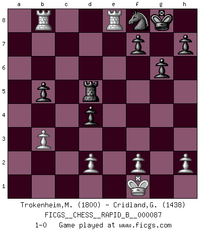 Last move : 1-0 2008 April 4 17:58:0 [Event "FICGS__CHESS__RAPID_B__000087"] [Site "FICGS"] [Date "2008.03.17"] [Round "1"] [White "Trokenheim,Marek"] [Black "Cridland,Graham"] [Result "1-0"] [WhiteElo "1800"] [BlackElo "1438"] 1.b4 Nf6 2.e3 d5 3.Nf3 Bg4 4.Bb2 Nbd7 5.c4 e5 6.Qa4 Bxf3 7.gxf3 a5 8.bxa5 c6 9.Qb3 Bc5 10.cxd5 cxd5 11.Bb5 d4 12.Na3 O-O 13.Nc4 Qe7 14.Kf1 Rfd8 15.Re1 Qe6 16.Rg1 Qh3+ 17.Rg2 Qxf3 18.exd4 Qxb3 19.axb3 Bxd4 20.Bxd4 exd4 21.Bxd7 Rxd7 22.Nb6 Rxa5 23.Nxd7 Nxd7 24.Rg4 Rd5 25.Re8+ Nf8 26.Rge4 g6 27.Rb8 b5 28.R4e8 1-0 Polish (Sokolsky) opening Kingside Castling by player Black (move 12) Player White won this chess game. Follow this game move after move (download)Combinations have always been the most intriguing aspect of Chess. The masters look for them, the public applauds them, the critics praise them. It is because combinations are possible that Chess is more than a lifeless mathematical exercise. They are the poetry of the game; they are to Chess what melody is to music. They represent the triumph of mind over matter. (Reuben Fine) Sie führen leise Selbstgespräche, schlürfen lautstark ihre Getränke, schmatzen hörbar beim Essen, blasen ihrem Gegenüber Rauch in die Augen, niesen ihm ins Gesicht, starren ihn unverwandt an, bis er sich unter ihren Blicken windet, rutschen ständig auf ihrem Stuhl hin und her, rülpsen und bohren in der Nase. (Anonymous) Botvinnik trató de alejar el misterio referente al Ajedrez, siempre relacionandolo a situaciones de la vida diaria. Solía llamar al Ajedrez un problema inexacto típico, similar a aquellos en que la gente tiene siempre que resolver a cada día. (Garry Kasparov) Soyez une menace à chaque fois que vous vous asseyez pour jouer. (Ken Smith) They say in chess you've got to kill the queen, and then you mate it... Oh I, do you ? (Red Hot Chili Peppers, Fortune faded)