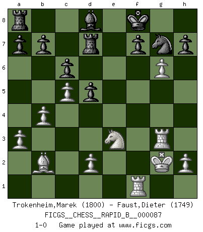 Last move : 1-0 2008 April 9 17:10:15 [Event "FICGS__CHESS__RAPID_B__000087"] [Site "FICGS"] [Date "2008.03.17"] [Round "1"] [White "Trokenheim,Marek"] [Black "Faust,Dieter"] [Result "1-0"] [WhiteElo "1800"] [BlackElo "1749"] 1.b4 e5 2.Bb2 Nf6 3.a3 d6 4.e3 Be7 5.Nf3 O-O 6.Be2 Qd7 7.O-O Qf5 8.c4 Qg6 9.Nc3 Bh3 10.Nh4 Qg5 11.f4 Qxh4 12.gxh3 c6 13.Qc2 Qxh3 14.Rf3 Qh6 15.Rg3 exf4 16.exf4 Re8 17.Rf1 Nbd7 18.Nd1 g6 19.Ne3 Bd8 20.Bf3 Bb6 21.Qc3 Kf8 22.Kg2 d5 23.c5 Bd8 24.Bg4 Re7 25.Bxd7 Rxd7 26.Qd4 Qg7 27.f5 Nh5 28.Qxg7+ Nxg7 29.fxg6 1-0 Polish (Sokolsky) opening Kingside Castling by player Black (move 5) Kingside Castling by player White (move 7) Player White won this chess game. Follow this game move after move (download)Dazzling combinations are for the many, shifting wood is for the few. (Georg Kieninger) Im Blitz ist es einfacher mit einer Figur weniger anzugreifen, als sich mit einer Mehrfigur zu verteidigen. (Mikhail Nekhemyevich Tal) El Ajedrez, como cualquier otra actividad creativa, puede existir solo a través de méritos combinados de aquellos que tienen talento creativo y de aquellos que tienen la habilidad de organizar un trabajo creativo. (Mikhail Botvinnik) Il n'y a pas eu de défaite parce que je ne crois pas que cet ordinateur ait jamais existé. IBM a triché en refusant d'imprimer les modes de recherche de la machine. C'est évident, pendant le match, des coups décisifs ont été joués par des êtres humains. Aujourd'hui, les meilleurs spécialistes en informatique ne peuvent toujours pas expliquer comment Deep-Blue a pu jouer contre la logique des ordinateurs. IBM a gagné une guerre de communication, mais ils sont incapables de prouver que l'ordinateur a gagné tout seul. (Garry Kasparov) Life is like internet, nothing interesting, but noone want to leave it. (Ilmars Cirulis)