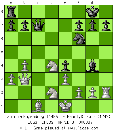 Last move : 0-1 2008 April 2 6:43:12 [Event "FICGS__CHESS__RAPID_B__000087"] [Site "FICGS"] [Date "2008.03.17"] [Round "1"] [White "Zaichenko,Andrey"] [Black "Faust,Dieter"] [Result "0-1"] [WhiteElo "1486"] [BlackElo "1749"] 1.b4 e5 2.a3 d5 3.Bb2 Bd6 4.e3 Nf6 5.c4 c6 6.cxd5 cxd5 7.Bb5+ Nc6 8.Nf3 Qc7 9.d3 O-O 10.Nbd2 Bg4 11.Qc2 Rfc8 12.Rc1 Qb6 13.Bxc6 Rxc6 14.Qb3 Rxc1+ 15.Bxc1 e4 16.dxe4 dxe4 17.Nd4 Bxh2 18.Rxh2 Qc7 0-1 Polish (Sokolsky) opening Kingside Castling by player Black (move 9) Player Black won this chess game. Follow this game move after move (download)It was clear to me that the vulnerable point of the American Grandmaster (Bobby Fischer) was in double-edged, hanging, irrational positions, where he often failed to find a win even in a won position. (Efim Geller) Sehr viele beherrschen heutzutage das große Einmalseins des Schachspiels und kennen sogar dessen Logarithmentafeln auswendig - deshalb sollte man hin und wieder zu beweisen trachten, dass zwei mal zwei auch fünf sein kann. (Mikhail Nekhemyevich Tal) El sobresalir en el Ajedrez es un signo de una mente intrigante. (Sir Arthur Conan Doyle) Ce qui est bien, c'est d'avoir tout un tas de pièces en prise : l'adversaire ne peut en prendre qu'une à la fois. Cité par Thierry Audin. Methinks King Thibault should dub Marius Zubac a knight of the square board... I mean table, henceforth addressing him as Sir Marius, and bestow on him a suitable land from the kingdom of FICGS & marry him off to a worthy, fair maiden, lest he slice our heads with his mighty sword in his wrath. (Dinesh De Silva)