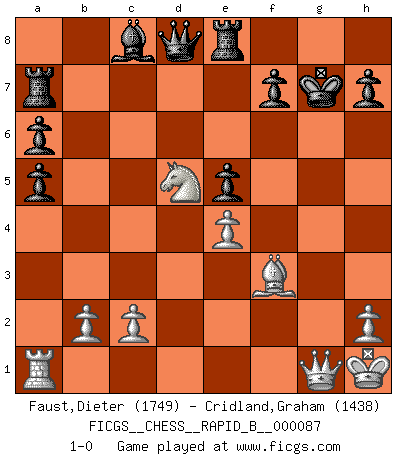 Last move : 1-0 2008 April 8 19:33:34 [Event "FICGS__CHESS__RAPID_B__000087"] [Site "FICGS"] [Date "2008.03.17"] [Round "1"] [White "Faust,Dieter"] [Black "Cridland,Graham"] [Result "1-0"] [WhiteElo "1749"] [BlackElo "1438"] 1.e4 c5 2.Nf3 d6 3.d4 cxd4 4.Nxd4 Nf6 5.Nc3 a6 6.Be2 e6 7.O-O Be7 8.a4 O-O 9.f4 Qc7 10.Kh1 Nc6 11.Be3 Re8 12.Bf3 Rb8 13.g4 Nxd4 14.Bxd4 e5 15.fxe5 dxe5 16.Ba7 Ra8 17.g5 Rxa7 18.gxf6 Bf8 19.fxg7 Bxg7 20.Nd5 Qd8 21.Rg1 b6 22.a5 bxa5 23.Rxg7+ Kxg7 24.Qg1+ 1-0 Sicilian : Najdorf, Opovcensky variation Kingside Castling by player White (move 7) Kingside Castling by player Black (move 8) Player White won this chess game. Follow this game move after move (download)A man without frontiers. He didn't divide the East and the West, he brought them together in their admiration for him. (Ljubomir Ljubojevic, about Bobby Fischer's death) Privat ist Kortschnoi kein schlechter Mensch, sehr sympathisch. Aber während des Spiels ist er grausam. Er will dich töten. (Miguel Najdorf) Una victoria por una combinación errónea, aunque sea espectacular, me llena de horror artístico. (Wilhelm Steinitz) J'ai toujours senti une vague pitié pour l'homme qui ne connaît rien aux échecs, tout comme j'en aurais pour un homme ignorant de l'amour. Les Echecs, comme la musique ou comme l'amour, ont le pouvoir de rendre heureux. (Siegbert Tarrasch) Chess, like love, like music, has the power to make people happy. (Siegbert Tarrasch)