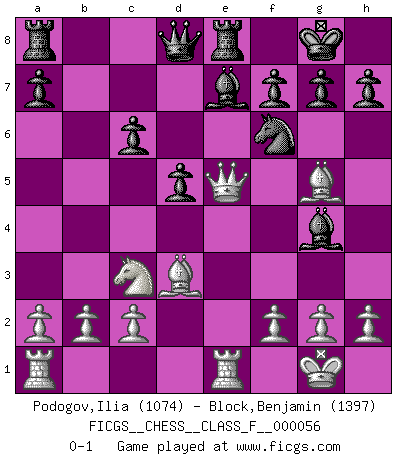 Last move : 0-1 2008 June 8 11:54:23 [Event "FICGS__CHESS__CLASS_F__000056"] [Site "FICGS"] [Date "2008.03.17"] [Round "1"] [White "Podogov,Ilia"] [Black "Block,Benjamin"] [Result "0-1"] [WhiteElo "1074"] [BlackElo "1397"] 1.e4 e5 2.Nf3 Nc6 3.Nc3 Nf6 4.d4 exd4 5.Nxd4 Bb4 6.Nxc6 bxc6 7.Bd3 d5 8.exd5 cxd5 9.Qe2+ Be7 10.O-O O-O 11.Re1 Re8 12.Bg5 Bg4 13.Qe5 c6 0-1 This chess game has been lost on time (started : 2008.03.17 13:47:53) Four knights : Scotch, 4...exd4 Kingside Castling by player White (move 10) Kingside Castling by player Black (move 10) Player Black won this chess game. Follow this game move after move (download)Is Bobby Fischer quite sane ? (Salo Flohr) Über die Verhaftung Bobby Fischers: Warum es die Bush-Administration für nötig befindet einen 61 Jahre alten Mann zu hetzten, der für niemanden ausser sich selbste eine Gefahr darstellt ist ein Rätsel. (Nigel Short) No hay precio que no valga la pena por la cabellera del Rey enemigo. (Koblentz) Un millionnaire : 'Monsieur Steinitz ! Vous ne participez aux tournois que pour l'argent, alors que moi je n'y viens que pour l'honneur.' Steinitz : 'Chacun joue pour ce qu'il n'a pas'... I've never seen so many men wasted so badly. (Blondie in The Good, The Bad and The Ugly)