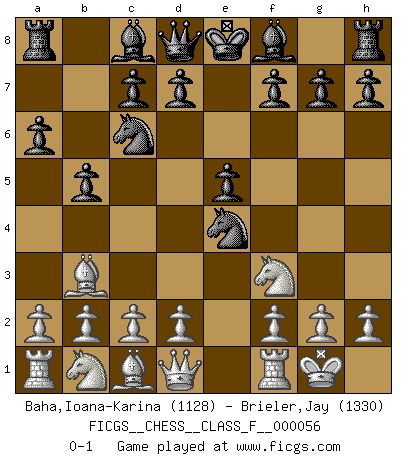 Last move : 0-1 2008 May 15 9:59:17 [Event "FICGS__CHESS__CLASS_F__000056"] [Site "FICGS"] [Date "2008.03.17"] [Round "1"] [White "Baha,Ioana-Karina"] [Black "Brieler,Jay"] [Result "0-1"] [WhiteElo "1128"] [BlackElo "1330"] 1.e4 e5 2.Nf3 Nc6 3.Bb5 a6 4.Ba4 Nf6 5.O-O b5 6.Bb3 Nxe4 0-1 This chess game has been lost on time (started : 2008.03.17 13:47:53) Ruy Lopez : 5.O-O Kingside Castling by player White (move 5) Player Black won this chess game. Follow this game move after move (download)Robert Fischer is a law unto himself. (Larry Evans) Woher wissen wir, daß der Neanderthaler Blindschach gespielt hat? -- Bei Ausgrabungen wurden keine Schachbretter und Figuren gefunden. (Anonymous) Nunca nadie ha ganado una partida de Ajedrez rindiendose. (Unknown) Si je n'étais pas joueur d'échecs, je serais le meilleur dans quelque chose d'autre. (Anatoli Karpov) Everybody lies. (Gregory House, House M.D.)