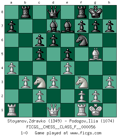 Last move : 1-0 2008 June 6 11:49:27 [Event "FICGS__CHESS__CLASS_F__000056"] [Site "FICGS"] [Date "2008.03.17"] [Round "1"] [White "Stoyanov,Zdravko"] [Black "Podogov,Ilia"] [Result "1-0"] [WhiteElo "1349"] [BlackElo "1074"] 1.e4 e5 2.Nf3 Nc6 3.Bb5 d6 4.Bxc6+ bxc6 5.h3 Nf6 6.d3 Be7 7.O-O O-O 8.Nc3 c5 9.Bd2 Bd7 10.Bg5 Rb8 11.b3 c6 12.a4 1-0 This chess game has been lost on time (started : 2008.03.17 13:47:53) Ruy Lopez : Old Steinitz defense Kingside Castling by player White (move 7) Kingside Castling by player Black (move 7) Player White won this chess game. Follow this game move after move (download)It is the aim of the modern school, not to treat every position according to one general law, but according to the principle inherent in the position. (Richard Reti) Ich glaube nicht an Psychologie, ich glaube an gute Züge. (Robert James Fischer) Cuando no sepas que mover, espera por una idea que se le venga a la la cabeza de tu oponente. Tenlo por seguro de que esa idea estará incorrecta. (Siegbert Tarrasch) Le système Elo représente seulement une moyenne. Il est simplement un indicateur de votre stabilité. (Anatoli Karpov) The right perception of any matter and a misunderstanding of the same matter do not wholly exclude each other. (Kafka's the trial)