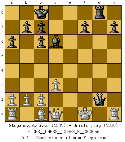 Last move : 0-1 2008 March 20 19:12:0 [Event "FICGS__CHESS__CLASS_F__000056"] [Site "FICGS"] [Date "2008.03.17"] [Round "1"] [White "Stoyanov,Zdravko"] [Black "Brieler,Jay"] [Result "0-1"] [WhiteElo "1349"] [BlackElo "1330"] 1.e4 e5 2.Nf3 Nc6 3.Bb5 a6 4.Bxc6 dxc6 5.d3 Bg4 6.Nbd2 Nf6 7.h3 Be6 8.O-O Bc5 9.Nxe5 Qd6 10.Nef3 O-O-O 11.e5 Qd7 12.exf6 gxf6 13.Ne4 Bxh3 14.gxh3 Qxh3 15.Nxf6 Rd6 16.Ng5 Qg3+ 17.Kh1 Qh4+ 18.Kg2 Rxf6 19.Ne4 Rg8+ 20.Ng3 Bd6 21.Rh1 Rxf2+ 22.Kxf2 Qxg3+ 23.Kf1 Qg2+ 0-1 Ruy Lopez : Exchange variation Kingside Castling by player White (move 8) Queenside Castling by player Black (move 10) Player Black won this chess game. Follow this game move after move (download)A bad plan is better than none at all. (Frank Marshall) Alles was am Schachbrett zählt sind gute Züge. (Robert James Fischer) La partida mas dura de ganar es una partida ganada. (Emanuel Lasker) Vouloir jouer aux échecs contre soi-même est aussi paradoxal que vouloir marcher sur son ombre. (Stefan Zweig) To steal ideas from one person is plagiarism. To steal from many is research. (Unknown)