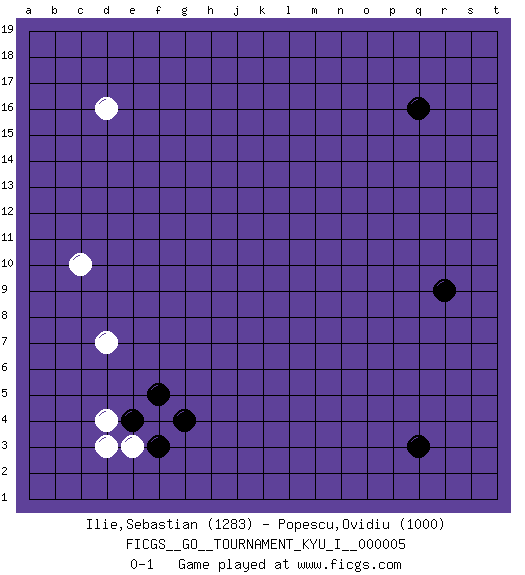 Last move : 0-1 2008 May 5 21:13:32 [Event "FICGS__GO__TOURNAMENT_KYU_I__000005"] [Site "FICGS"] [Date "2008.03.17"] [Round "1"] [Black "Ilie,Sebastian"] [White "Popescu,Ovidiu"] [Result "0-1"] [Rating 1 "1283"] [Rating 2 "1000"] 1.q16 d4 2.q3 d16 3.r9 c10 4.f3 f4 5.g4 e3 6.f5 d7 7.e4 d3 0-1 This go game has been lost on time (started : 2008.03.17 20:13:49) Here are the names of the openings (joseki) played in the four corners : Corner d4 : d4 f3 Hoshi (Hwajeom, Seongjeom, Xingwei`) 4-4 Point. The star or hoshi (4-4) point, emphasizing influence at the potential expense of territory. Ikken Kakari (Hankan Keolch'im, Yi Gua`jiao~, 1-Space Low Approach). Black 2 is the standard approach move to the 4-4. Player White won this Go (weiqi, baduk) game. Follow this game move after move (download)The poor player plays the opponent's game for him. (Anonymous) The ego is not master in its own house. (Sigmund Freud)