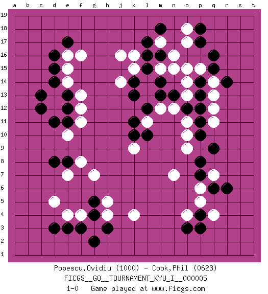 Last move : 1-0 2008 August 8 5:18:8 [Event "FICGS__GO__TOURNAMENT_KYU_I__000005 "] [Site "FICGS"] [Date "2008.03.17"] [Round "1"] [Black "Popescu,Ovidiu "] [White "Cook,Phil "] [Result "1-0"] [Rating 1 "1000"] [Rating 2 "0623"] 1.q16 q4 2.d16 d5 3.e3 e4 4.d3 d13 5.d8 e7 6.d11 f16 7.e17 e16 8.d15 e15 9.d14 e14 10.c13 d12 11.c12 q13 12.r14 q14 13.q15 j16 14.e11 f11 15.e13 e10 16.e8 n16 17.l16 k16 18.m16 o15 19.m14 m15 20.l15 n15 21.p14 o14 22.p13 q12 23.p12 q11 24.m13 o13 25.o12 k15 26.k14 j14 27.k13 f13 28.e12 f12 29.q6 q7 30.r6 g3 31.f3 f4 32.g4 h4 33.g5 g7 34.h3 f8 35.q9 h5 36.g2 k4 37.p7 n7 38.o3 o4 39.p4 p5 40.p3 p6 41.p8 o9 42.p10 o10 43.p11 n12 44.n13 m12 45.l12 p15 46.p17 o17 47.p18 o18 48.m18 m17 49.l17 o11 50.k10 l11 51.k11 k9 52.l10 1-0 This go game has been lost on time (started : 2008.03.17 20:13:49) Here are the names of the openings (joseki) played in the four corners : Corner d4 : d5 e3Takamoku (Gomok, Gaomu`) 5-4 Point. The takamoku (high) point (5-4). With its emphasis on influence, the 5-4 point complements the 4-4 (hoshi) point in creating an influence-oriented fuseki. Corner d16 : d16 d13Hoshi (Hwajeom, Seongjeom, Xingwei`) 4-4 Point. The star or hoshi (4-4) point, emphasizing influence at the potential expense of territory.Nikken Takagakari (Dukan Nop'dakeolch'im, E`r Gaojia, 2-Space High Approach). White 2 is a light approach move. Rarely played in even games, White 2 is typically employed in handicap games. Black continues with 6-4 or 3-10. In Korean Sunjang Baduk Black has a stone on 8-4. Corner q16 : q16 q13Hoshi (Hwajeom, Seongjeom, Xingwei`) 4-4 Point. The star or hoshi (4-4) point, emphasizing influence at the potential expense of territory.Nikken Takagakari (Dukan Nop'dakeolch'im, E`r Gaojia, 2-Space High Approach). White 2 is a light approach move. Rarely played in even games, White 2 is typically employed in handicap games. Black continues with 6-4 or 3-10. In Korean Sunjang Baduk Black has a stone on 8-4. Corner q4 : q4 q6Hoshi (Hwajeom, Seongjeom, Xingwei`) 4-4 Point. The star or hoshi (4-4) point, emphasizing influence at the potential expense of territory.Ikken Takagakari (Hankan Nop'dakeolch'im, Yi Gaojia, 1-Space High Approach). White typically responds at 6-4 or 3-10. White 4-10 is played when White finds play on the right side advantageous. White 4-8 or 3-8 may be played when White has support at top. Player Black won this Go (weiqi, baduk) game.Follow this game move after move (download ) Six eyes in a rectangle are alive. (Anonymous) The only sure thing about luck is that it will change. (Wilson Mizner)