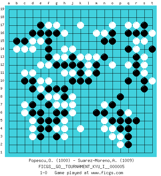 Last move : 1-0 2008 July 23 19:17:55 [Event "FICGS__GO__TOURNAMENT_KYU_I__000005"] [Site "FICGS"] [Date "2008.03.17"] [Round "1"] [Black "Popescu,Ovidiu"] [White "Suarez-Moreno,Alejandro"] [Result "1-0"] [Rating 1 "1000"] [Rating 2 "1009"] 1.d16 d5 2.q4 d3 3.q16 c14 4.c15 d14 5.q10 o17 6.q14 f17 7.f16 k17 8.e17 g17 9.d10 e15 10.e16 q6 11.r5 p5 12.p4 o4 13.o5 n4 14.p6 o6 15.q5 n5 16.p5 n7 17.p8 q17 18.r16 r17 19.d7 c11 20.c10 d11 21.e4 d4 22.e3 g4 23.e5 c7 24.d6 c6 25.m6 k4 26.n6 p2 27.q2 p3 28.q3 o3 29.o7 f6 30.e6 f8 31.e8 e9 32.d9 e10 33.f9 f10 34.g9 g8 35.g3 h3 36.g5 h5 37.f4 h4 38.g6 h7 39.h9 h11 40.h8 g7 41.h6 j6 42.f5 j8 43.f7 j7 44.j10 j11 45.k10 q12 46.o16 n16 47.o15 o12 48.n15 m16 49.m12 l11 50.k11 l12 51.l10 m13 52.k12 k13 53.m11 l13 54.j12 h13 55.j13 j14 56.h12 g13 57.g12 f12 58.g16 h16 59.f14 h14 60.f13 e12 61.f15 d15 62.b15 b14 63.n13 s15 64.r13 s13 65.s16 r14 66.r12 s12 67.r11 s11 68.s10 t10 69.s9 t16 70.s17 r15 71.t14 1-0 Here are the names of the openings (joseki) played in the four corners : Corner d16 : d16 c14 Hoshi (Hwajeom, Seongjeom, Xingwei`) 4-4 Point. The star or hoshi (4-4) point, emphasizing influence at the potential expense of territory. Ikken Kakari (Hankan Keolch'im, Yi Gua`jiao~, 1-Space Low Approach). White 2 is the standard approach move to the 4-4. Corner q16 : q16 o17 Hoshi (Hwajeom, Seongjeom, Xingwei`) 4-4 Point. The star or hoshi (4-4) point, emphasizing influence at the potential expense of territory. Ikken Kakari (Hankan Keolch'im, Yi Gua`jiao~, 1-Space Low Approach). White 2 is the standard approach move to the 4-4. Corner q4 : q4 q6 Hoshi (Hwajeom, Seongjeom, Xingwei`) 4-4 Point. The star or hoshi (4-4) point, emphasizing influence at the potential expense of territory. Ikken Takagakari (Hankan Nop'dakeolch'im, Yi Gaojia, 1-Space High Approach). Black typically responds at 6-4 or 3-10. Black 4-10 is played when Black finds play on the right side advantageous. Black 4-8 or 3-8 may be played when Black has support at top. Player Black won this Go (weiqi, baduk) game. Follow this game move after move (download)There is no territory in the centre. (Anonymous) Mac users swear by their computers. PC users swear at their computers. (Author unknown)