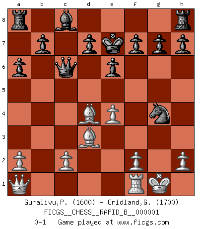 Last move : 0-1 2006 April 19 18:42:3 [Event "FICGS__CHESS__RAPID_B__000001"] [Site "FICGS"] [Date "2006.04.14"] [Round "1"] [White "Guralivu,Paul-Iosif"] [Black "Cridland,Graham"] [Result "0-1"] [WhiteElo "1600"] [BlackElo "1700"] 1.e4 c5 2.Nf3 Nc6 3.Nc3 e6 4.d4 cxd4 5.Nxd4 Qc7 6.Be3 a6 7.Nxc6 Qxc6 8.Bd3 Ba3 9.Bd4 Bxb2 10.O-O Bxc3 11.Be3 Bxa1 12.Qxa1 Nf6 13.Bd4 Ke7 14.g4 Nxg4 0-1 Sicilian defense Kingside Castling by player White (move 10) Player Black won this chess game. Follow this game move after move (download)Human affairs are like a Chess game: only those who do not take it seriously can be called good players. (Hung Tzu Ch'eng) Die größte Kunst beim Schach besteht darin dem Gegner nicht zu zeigen was er tun kann. (Garry Kasparov) Cada Peón es potencialmente una Reina. (James Mason) La tactique est l'élément le plus important du milieu de jeu. (Siegbert Tarrasch) The ultimate in disposing one's troops is to be without ascertainable shape. Then the most penetrating spies cannot pry in nor can the wise lay plans against you. (Sun Tzu)