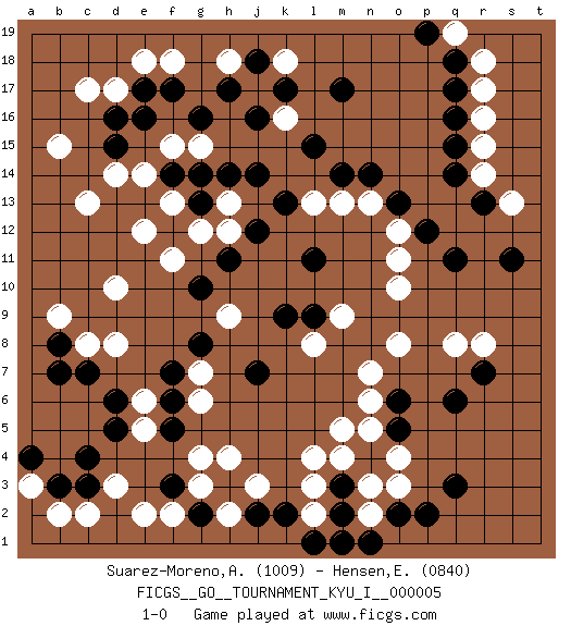Last move : 1-0 2008 September 17 9:57:53 [Event "FICGS__GO__TOURNAMENT_KYU_I__000005"] [Site "FICGS"] [Date "2008.03.17"] [Round "1"] [Black "Suarez-Moreno,Alejandro"] [White "Hensen,Erik"] [Result "1-0"] [Rating 1 "1009"] [Rating 2 "0840"] 1.q16 d17 2.q3 d3 3.d5 d8 4.f5 g3 5.c3 c2 6.c4 e2 7.c7 c8 8.b8 b9 9.b7 c13 10.q6 r8 11.r7 q8 12.q11 o8 13.n4 o10 14.m17 m9 15.h17 r16 16.q14 o12 17.d15 f18 18.e17 e18 19.d16 c17 20.f17 r15 21.q15 r18 22.q17 r17 23.q18 s13 24.r13 k16 25.l15 f15 26.e16 e14 27.g14 d10 28.g16 k18 29.k17 h18 30.j18 g15 31.j16 b15 32.j14 r14 33.o13 n13 34.p12 o11 35.n14 l13 36.m14 l3 37.m3 l4 38.l11 n6 39.o6 m5 40.l9 l8 41.k9 n7 42.s11 g12 43.f12 f11 44.g13 h12 45.j12 h13 46.h14 d14 47.f14 m13 48.k13 e12 49.h11 o3 50.m2 o4 51.o5 l2 52.l1 n5 53.j2 m4 54.g2 j3 55.f3 f2 56.h3 g4 57.k2 h4 58.o2 n2 59.n1 n3 60.p2 h2 61.m1 g7 62.j7 a3 63.b3 b2 64.a4 q19 65.p19 e6 66.d6 h9 67.g10 f13 68.g8 e5 69.f7 g6 70.f6 1-0 This go game has been lost on time (started : 2008.03.17 20:13:49) Here are the names of the openings (joseki) played in the four corners : Corner d4 : d3 d5 Komoku (Somok, Xiao~mu`) 3-4 Point. The komoku (3-4) point is the traditional corner enclosure move.. Ikken Takagakari (Hankan Nop'dakeolch'im, Yi Gaogua`jiao~, 1-Space High Approach). The 5-4 approach move has become more popular in modern times, as modern Go emphasizes speed and influence. Player Black won this Go (weiqi, baduk) game. Follow this game move after move (download)While the Baroque rules of chess could only have been created by humans, the rules of go are so elegant, organic, and rigorously logical that if intelligent life forms exist elsewhere in the universe, they almost certainly play go. (Edward Lasker, international chess master) He is a liar. I just don't know what the lie is yet. (Horatio Caine, C.S.I. Miami)