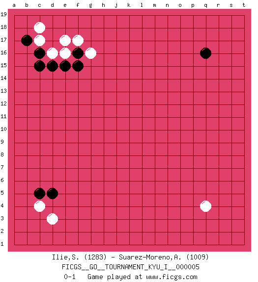 Last move : 0-1 2008 May 3 9:6:53 [Event "FICGS__GO__TOURNAMENT_KYU_I__000005 "] [Site "FICGS"] [Date "2008.03.17"] [Round "1"] [Black "Ilie,Sebastian "] [White "Suarez-Moreno,Alejandro "] [Result "0-1"] [Rating 1 "1283"] [Rating 2 "1009"] 1.q16 d3 2.c16 q4 3.c5 c4 4.d5 e16 5.e15 d16 6.d15 c17 7.c15 g16 8.f16 f17 9.f15 e17 10.b17 c18 0-1 This go game has been lost on time (started : 2008.03.17 20:13:49) Here are the names of the openings (joseki) played in the four corners : Corner d4 : d3 c5Komoku (Somok, Xiao~mu`) 3-4 Point. The komoku (3-4) point is the traditional corner enclosure move..Ikken Kakari (Hankan Keolch'im, Yi Gua`jiao~, 1-Space Low Pincer). The small knight move is the basic approach move to the 3-4 point stone. It has been continually used for over four centuries. There are limitless variations, with new moves constantly being discovered. Black 2 opens the door to a treaure store of joseki. Corner d16 : c16 e16Komoku (Somok, Xiao~mu`) 3-4 Point. The komoku (3-4) point is the traditional corner enclosure move..Ikken Takagakari (Hankan Nop'dakeolch'im, Yi Gaogua`jiao~, 1-Space High Approach). The 5-4 approach move has become more popular in modern times, as modern Go emphasizes speed and influence. Player White won this Go (weiqi, baduk) game.Follow this game move after move (download ) Don't disturb symmetry. (Anonymous) Beta. Software undergoes beta testing shortly before it's released. Beta is latin for still doesn't work. (Anonymous)