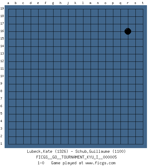 Last move : 1-0 2008 April 17 7:52:17 [Event "FICGS__GO__TOURNAMENT_KYU_I__000005"] [Site "FICGS"] [Date "2008.03.17"] [Round "1"] [Black "Lubeck,Kate"] [White "Schub,Guillaume"] [Result "1-0"] [Rating 1 "1326"] [Rating 2 "1100"] 1.r16 1-0 This go game has been lost on time (started : 2008.03.17 20:13:49) Here are the names of the openings (joseki) played in the four corners : Player Black won this Go (weiqi, baduk) game. Follow this game move after move (download)When your opponent is thick, you must also become thick. (Otake Hideo, 9p) The real voyage of discovery consists not in seeking new lands but in seeing with new eyes. (Marcel Proust)
