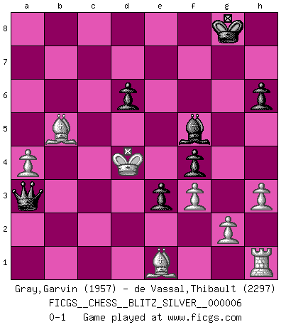 Last move : 0-1 2008 March 18 17:45:8 [Event "FICGS__CHESS__BLITZ_SILVER__000006"] [Site "FICGS"] [Date "2008.03.18"] [Round "1"] [White "Gray,Garvin"] [Black "de Vassal,Thibault"] [Result "0-1"] [WhiteElo "1957"] [BlackElo "2297"] 1.d4 Nf6 2.c4 g6 3.Nc3 Bg7 4.e4 d6 5.f3 O-O 6.Be3 e5 7.d5 Nh5 8.Qd2 f5 9.Nge2 a6 10.exf5 gxf5 11.O-O-O b5 12.Ng3 Nf6 13.Bg5 b4 14.Nce2 Qe8 15.Qxb4 Qg6 16.Qd2 Nbd7 17.Nc3 h6 18.Bh4 Rb8 19.Nge2 Rb4 20.b3 Nc5 21.Na4 Rxa4 22.bxa4 Bd7 23.Qa5 e4 24.Qxc7 Qe8 25.Nd4 Qe5 26.Be1 Rc8 27.Qa7 Nxd5 28.cxd5 Qxd5 29.Kb1 Be6 30.Rd2 Bxd4 31.Bxa6 Nb3 32.Qxd4 Rc1+ 33.Kb2 Nxd4 34.Kxc1 e3 35.Rxd4 Qxd4 36.Bb5 Qa1+ 37.Kc2 Qxa2+ 38.Kc3 Qa3+ 39.Kd4 f4 40.h3 Bf5 0-1 Comment by player 2 : Thibault de Vassal : Thank you for an interesting game. King's indian is not completely dead :) King's Indian : Saemisch, Orthodox, 7.d5 Kingside Castling by player Black (move 5) Queenside Castling by player White (move 11) Player Black won this chess game. Follow this game move after move (download)We like to think. (Gary Kasparov) Versuche, dich von der Sklaverei der Eröffnungsvarianten zu befreien. Stattdessen soll man gewisse Typenpositionen erlernen, die man eingehend analysiert. (Aaron Nimzowitsch) Con el fin de mejorar tu juego, debes de estudiar los finales antes que todo, ya que mientras que los finales pueden ser estudiados y dominados por sí mismos, el juegomedio y la apertura deben de ser estudiados en relación con los finales. (José Raúl Capablanca) Mais l'homme est une créature légère et illogique : semblable au joueur d'échecs, il n'aime que le processus du but à atteindre, non le but lui-même. (Dostoïevsky) Hold em is to stud what chess is to checkers. (Johnny Moss)