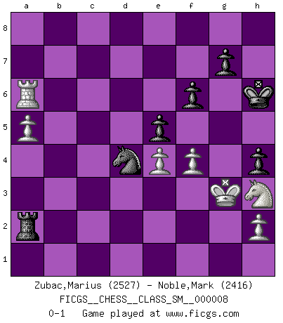 Last move : 0-1 2008 December 5 15:29:16 [Event "FICGS__CHESS__CLASS_SM__000008"] [Site "FICGS"] [Date "2008.03.18"] [Round "1"] [White "Zubac,Marius"] [Black "Noble,Mark"] [Result "0-1"] [WhiteElo "2527"] [BlackElo "2416"] 1.d4 Nf6 2.c4 e6 3.Nc3 Bb4 4.f3 d5 5.a3 Bxc3+ 6.bxc3 c5 7.cxd5 Nxd5 8.Qd3 b6 9.e4 Ba6 10.c4 Nf6 11.dxc5 Qxd3 12.Bxd3 Nfd7 13.cxb6 axb6 14.Bb2 Nc6 15.Be2 O-O 16.Nh3 Rfc8 17.Kf2 Na5 18.Rhd1 Nc5 19.Rac1 Na4 20.Bc3 Nb3 21.Rc2 Bxc4 22.Bb4 Bxe2 23.Rxc8 Rxc8 24.Kxe2 Nb2 25.Rd6 h6 26.Rxb6 Rc2+ 27.Kf1 Nc4 28.Rb8+ Kh7 29.Rd8 Ne3+ 30.Kg1 Rxg2+ 31.Kh1 Rb2 32.Rd7 f6 33.a4 e5 34.Ba3 Rb1+ 35.Ng1 Nd4 36.Bc5 Nec2 37.Bxd4 Nxd4 38.Kg2 Rb2+ 39.Kg3 Ra2 40.Ra7 Ne6 41.Nh3 h5 42.a5 Kh6 43.Ra6 Nd4 44.f4 h4+ 0-1 Nimzo-Indian : Kmoch variation Kingside Castling by player Black (move 15) Player Black won this chess game. Follow this game move after move (download)The game of chess is the touchstone of the intellect. (Goethe) Nie in meinem Leben habe ich die französische Verteidigung gespielt, welche die Stumpfsinnigste von allen ist. (Wilhelm Steinitz) Observen a Garry Kasparov. Después de una derrota, invariablemente el gana la próxima partida. Prácticamente hace pedazos a su siguiente oponente. Eso es algo que tenemos que aprender a lograr. (Maurice Ashley) La vie est comme un jeu d'échecs : nous esquissons un plan, mais celui-ci est tributaire de ce que daignent faire l'adversaire aux échecs et le destin dans la vie. (Arthur Schopenhauer) Kids, you tried your best and you failed miserably. The lesson is, never try. (Simpsons)