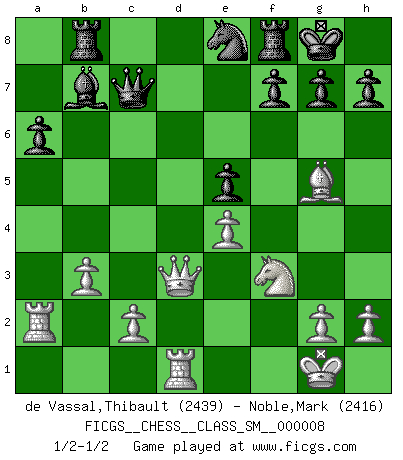 Last move : 1/2-1/2 2008 June 6 21:37:56 [Event "FICGS__CHESS__CLASS_SM__000008"] [Site "FICGS"] [Date "2008.03.18"] [Round "1"] [White "de Vassal,Thibault"] [Black "Noble,Mark"] [Result "1/2-1/2"] [WhiteElo "2439"] [BlackElo "2416"] 1.e4 c5 2.Nf3 d6 3.d4 cxd4 4.Nxd4 Nf6 5.Nc3 a6 6.f4 e5 7.Nf3 Nbd7 8.a4 Be7 9.Bc4 Qa5 10.Qe2 b5 11.Ba2 bxa4 12.O-O O-O 13.Bd5 Rb8 14.Rxa4 Qd8 15.Ra2 Nxd5 16.Nxd5 Nf6 17.Nxe7+ Qxe7 18.fxe5 dxe5 19.b3 Qc7 20.Bg5 Ne8 21.Rd1 Bb7 22.Qd3 1/2-1/2 Sicilian : Najdorf, 6.f4 Kingside Castling by player White (move 12) Kingside Castling by player Black (move 12) This chess game ended in a draw. Follow this game move after move (download)Chess is really ninety nine percent calculation. (Soltis) Habe Mut, dich deines eigenen Verstandes zu bedienen. (Immanuel Kant) Buenas posiciones no logran ganar juegos, buenas movidas sí. (Gerald Abrahams) Même si vous avez un bon coup à faire, regardez toujours s'il n'y en a pas un qui lui soit préférable. (Pedro Damiano) A good teacher is like a candle - it consumes itself to light the way for others. (Author unknown)