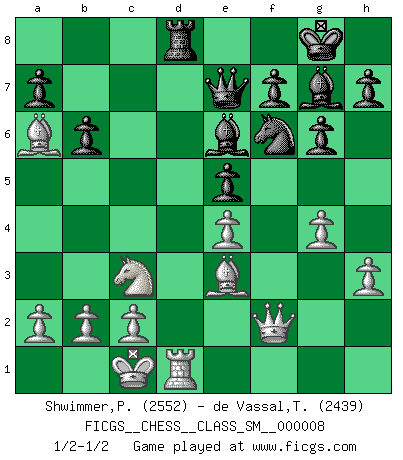 Last move : 1/2-1/2 2008 May 16 9:56:26 [Event "FICGS__CHESS__CLASS_SM__000008"] [Site "FICGS"] [Date "2008.03.18"] [Round "1"] [White "Shwimmer,Peter"] [Black "de Vassal,Thibault"] [Result "1/2-1/2"] [WhiteElo "2552"] [BlackElo "2439"] 1.e4 d6 2.d4 Nf6 3.Nc3 g6 4.Be3 c6 5.h3 Bg7 6.f4 O-O 7.Nf3 Nbd7 8.Bd3 c5 9.Qd2 cxd4 10.Bxd4 e5 11.fxe5 Nxe5 12.Nxe5 dxe5 13.Bc5 Re8 14.Qf2 b6 15.Be3 Be6 16.O-O-O Qe7 17.Ba6 Rad8 18.g4 Rxd1+ 19.Rxd1 Rd8 1/2-1/2 Pirc defense Kingside Castling by player Black (move 6) Queenside Castling by player White (move 16) This chess game ended in a draw. Follow this game move after move (download)Before the endgame, the Gods have placed the middle game. (Siegbert Tarrasch) Um dein Spiel zu verbessern musst du zuallererst das Endspiel studieren, denn diese kann unabhängig studiert werden. Die Eröffnung und das Mittelspiel müssen immer in Bezug gesetzt werden zum Endspiel. (José Raúl Capablanca) Si el ingenio solamente fuese necesario para lucirse, las mujeres serían las mejores jugadoras de Ajedrez del mundo. (Albin) Le profane ne songe pas à la somme de jouissance dont il se prive, qui méconnaît ce jeu aux ressources aussi variées que passionnantes. (Jean-Marie Jeanton-Lamarche) Men never do evil so completely and cheerfully as when they do it from religious conviction. (Blaise Pascal)