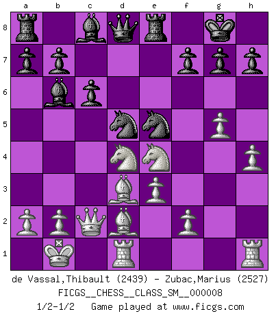 Last move : 1/2-1/2 2008 July 14 14:3:31 [Event "FICGS__CHESS__CLASS_SM__000008"] [Site "FICGS"] [Date "2008.03.18"] [Round "1"] [White "de Vassal,Thibault"] [Black "Zubac,Marius"] [Result "1/2-1/2"] [WhiteElo "2439"] [BlackElo "2527"] 1.d4 d5 2.c4 c6 3.Nc3 e6 4.e3 Nf6 5.Nf3 Nbd7 6.Qc2 Bd6 7.g4 dxc4 8.Bxc4 e5 9.g5 Nd5 10.Ne4 Bc7 11.Bd2 O-O 12.O-O-O exd4 13.Nxd4 Ne5 14.Be2 Re8 15.Kb1 Bb6 16.h4 Ng4 17.Bd3 Ne5 1/2-1/2 QGD Slav defense Kingside Castling by player Black (move 11) Queenside Castling by player White (move 12) This chess game ended in a draw. Follow this game move after move (download)Methodical thinking is of more use in Chess than inspiration. (C. J. S. Purdy) Schon mancher Spieler hat aufgegeben, um zu vermeiden, daß er eine Figur verliert. (Savielly Grigorievitsch Tartakower) En el Ajedrez, tal como en la vida, las bendiciones de hoy pueden ser el veneno del mañana. (Assaic) Vouloir jouer aux échecs contre soi-même est aussi paradoxal que vouloir marcher sur son ombre. (Stefan Zweig) May I never be complete. May I never be content. May I never be perfect. Deliver me, Tyler, from being perfect and complete. (Chuck Palahniuk, Fight Club)