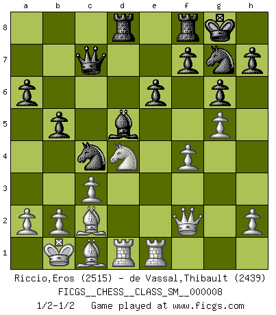 Last move : 1/2-1/2 2008 July 28 17:45:29 [Event "FICGS__CHESS__CLASS_SM__000008"] [Site "FICGS"] [Date "2008.03.18"] [Round "1"] [White "Riccio,Eros"] [Black "de Vassal,Thibault"] [Result "1/2-1/2"] [WhiteElo "2515"] [BlackElo "2439"] 1.e4 d6 2.d4 Nf6 3.Nc3 g6 4.Be3 Bg7 5.f3 c6 6.Qd2 b5 7.g4 O-O 8.g5 Nh5 9.Nce2 c5 10.c3 cxd4 11.Nxd4 a6 12.O-O-O Qc7 13.Nge2 Bxd4 14.Nxd4 Nd7 15.Kb1 Bb7 16.Rg1 Ne5 17.Qf2 Nc4 18.Bc1 d5 19.exd5 Rad8 20.f4 Bxd5 21.Bd3 Ng7 22.Bc2 e6 23.Rge1 1/2-1/2 Pirc defense Kingside Castling by player Black (move 7) Queenside Castling by player White (move 12) This chess game ended in a draw. Follow this game move after move (download)No one ever won a game by resigning. (Unknown) Wenn man heute mit 14 Jahren noch kein GM ist, kann man es vergessen. (Viswanathan Anand) Por esta medida (el intervalo entre Fischer y sus contemporaneos), yo le considero el mas grande campeón mundial. (Garry Kasparov) Les sacrifices démontrent seulement que quelqu'un a gaffé. (Savielly Tartacover) Games, world of games... There's always an opponent, and there's always a victim. (Revolver, movie)