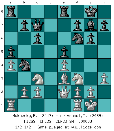 Last move : 1/2-1/2 2008 May 24 9:13:34 [Event "FICGS__CHESS__CLASS_SM__000008"] [Site "FICGS"] [Date "2008.03.18"] [Round "1"] [White "Makovsky,Petr"] [Black "de Vassal,Thibault"] [Result "1/2-1/2"] [WhiteElo "2447"] [BlackElo "2439"] 1.e4 d6 2.d4 Nf6 3.Nc3 g6 4.Nf3 Bg7 5.Be2 O-O 6.O-O c6 7.a4 a5 8.h3 Na6 9.Be3 Nb4 10.Qd2 Qc7 11.Bh6 e5 12.Bc4 Re8 13.dxe5 dxe5 14.Be3 Be6 15.Bxe6 Rxe6 16.Qe2 R6e8 1/2-1/2 Pirc : Classical system, 5.Be2 Kingside Castling by player Black (move 5) Kingside Castling by player White (move 6) This chess game ended in a draw. Follow this game move after move (download)Chess is a beautiful mistress. (Bent Larsen) Schachspieler können ausgezeichnet Varianten am Schachbrett berechnen, aber nicht im realen Leben. Zu stark ist der Individualismus im Schach ausgeprägt, und für viele ist ein kleiner momentaner persönlicher Vorteil wichtiger als ein weit größerer Vorteil von morgen. (Anatoly Karpov) El Ajedrez, como cualquier actividad creativa, solo puede existir a través del esfuerzo combinado de aquellos que tienen talento creativo y de aquellos que poseen la habilidad de organizar su trabajo creativo. (Mikhail Botvinnik) Karpov est une pièce de musée. (Garry Kasparov) The only thing that overcomes hard luck is hard work. (Harry Golden)