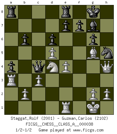 Last move : 1/2-1/2 2008 June 7 18:59:42 [Event "FICGS__CHESS__CLASS_A__000038"] [Site "FICGS"] [Date "2008.03.19"] [Round "1"] [White "Staggat,Rolf"] [Black "Guzman,Carlos"] [Result "1/2-1/2"] [WhiteElo "2001"] [BlackElo "2102"] 1.e4 d6 2.d4 Nf6 3.Nc3 g6 4.f4 Bg7 5.Nf3 O-O 6.Bd3 Na6 7.O-O c5 8.d5 Nc7 9.Qe1 Rb8 10.a4 b6 11.Qh4 Ba6 12.Nb5 c4 13.Bxc4 Nxb5 14.axb5 Qc7 15.Bb3 Bxb5 16.Re1 Bc4 17.Bxc4 Qxc4 18.c3 a5 19.Nd4 a4 20.f5 Ra8 21.fxg6 hxg6 22.Bg5 Rfe8 23.Ra3 Nh5 1/2-1/2 Pirc : Austrian attack, 6.Bd3 Kingside Castling by player Black (move 5) Kingside Castling by player White (move 7) This chess game ended in a draw. Follow this game move after move (download)Chess is the art of analysis. (Mikhail Botvinnik) Wenn ein Kopf und ein Buch zusammenstoßen und es klingt hohl, ist es denn allemal im Buche? (Georg Christoph Lichtenberg) Hay jugadores fuertes y personas amables y yo soy un jugador fuerte. (Bobby Fischer) Toutes les manuvres exécutées sur une colonne ouverte ont pour but ultime l'intrusion définitive sur la septième ou la huitième rangée, en plein cur de la position ennemie. (Aaron Nimzovitch) Perception is reality. (Immanuel Kant)