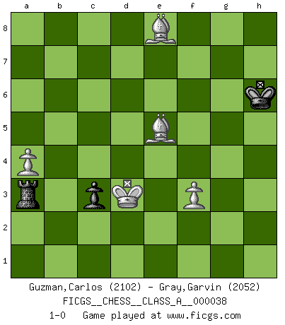 Last move : 1-0 2008 July 21 9:2:20 [Event "FICGS__CHESS__CLASS_A__000038"] [Site "FICGS"] [Date "2008.03.19"] [Round "1"] [White "Guzman,Carlos"] [Black "Gray,Garvin"] [Result "1-0"] [WhiteElo "2102"] [BlackElo "2052"] 1.e4 e5 2.Nf3 Nc6 3.d4 exd4 4.Bc4 Nf6 5.e5 Ng4 6.O-O d6 7.exd6 Bxd6 8.Re1+ Kf8 9.Nbd2 Nge5 10.Nxe5 Nxe5 11.Bb3 Qh4 12.h3 Bxh3 13.Rxe5 Bxe5 14.Qf3 Bf6 15.gxh3 Re8 16.Kg2 Re1 17.Nf1 Qe4 18.Qxe4 Rxe4 19.Bd2 g6 20.Ng3 Re8 21.h4 Kg7 22.Kh3 d3 23.cxd3 Bxb2 24.Rg1 h5 25.Nf5+ Kf6 26.Rb1 gxf5 27.Rxb2 Rhg8 28.d4 Kg6 29.Be3 Re7 30.Rb1 c6 31.Rg1+ Kh7 32.Rd1 Rd7 33.d5 a5 34.dxc6 Rxd1 35.Bxd1 bxc6 36.Bxh5 Kg7 37.Kg3 c5 38.Be2 Re8 39.Bb5 Re5 40.Bd2 Rd5 41.Bxa5 c4 42.a4 Rd3+ 43.Kf4 Rd5 44.h5 f6 45.Bb4 Kh8 46.h6 Kh7 47.Bc3 Kxh6 48.Bxf6 Kg6 49.Be5 Rd2 50.f3 Ra2 51.Be8+ Kh6 52.Kxf5 Ra3 53.Ke4 c3 54.Kd3 1-0 Scotch gambit : Dubois-Reti defense Kingside Castling by player White (move 6) 10 pieces endgame at move 47 : White KBBPP , Black KRPPP WHITE : King + 2 Bishops 2 Pawns BLACK : King + 1 Rook 3 Pawns 9 pieces endgame at move 48 : White KBBPP , Black KRPP WHITE : King + 2 Bishops 2 Pawns BLACK : King + 1 Rook 2 Pawns 8 pieces endgame at move 52 : White KBBPP , Black KRP WHITE : King + 2 Bishops 2 Pawns BLACK : King + 1 Rook 1 Pawn Player White won this chess game. Follow this game move after move (download)When you see a good move, look for a better one. (Emanuel Lasker) Es gibt zwei Arten von Opfern: Korrekte und meine. (Mikhail Nekhemyevich Tal) El Ajedrez es como la guerra en un tablero. (Bobby Fischer) Avant la finale, les dieux ont créé le milieu de partie. (Tarrasch) Looking at the proliferation of personal web pages on the Net, it looks like very soon everyone on Earth will have 15 megabytes of fame. (M.G. Sriram)