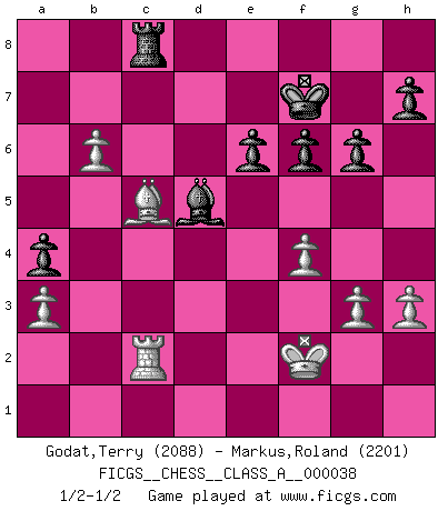 Last move : 1/2-1/2 2008 May 8 11:40:2 [Event "FICGS__CHESS__CLASS_A__000038"] [Site "FICGS"] [Date "2008.03.19"] [Round "1"] [White "Godat,Terry"] [Black "Markus,Roland"] [Result "1/2-1/2"] [WhiteElo "2088"] [BlackElo "2201"] 1.c4 b6 2.Nc3 c5 3.g3 Bb7 4.e4 g6 5.Nge2 Bg7 6.d4 cxd4 7.Nxd4 Nc6 8.Be3 Nf6 9.Bg2 Ne5 10.O-O Nfg4 11.Bf4 O-O 12.b3 d6 13.h3 Nc6 14.Nxc6 Bxc6 15.Rc1 Ne5 16.Be3 Nd7 17.Qd2 a5 18.Nd5 Rc8 19.f4 e6 20.Nc3 Nc5 21.Rfd1 a4 22.b4 Bxc3 23.Rxc3 Nxe4 24.Bxe4 Bxe4 25.Qxd6 Qxd6 26.Rxd6 b5 27.Bc5 bxc4 28.Rxc4 Bd5 29.Rc2 Rfd8 30.Rxd8+ Rxd8 31.b5 Rc8 32.b6 f6 33.Kf2 Kf7 34.a3 1/2-1/2 English Opening Kingside Castling by player White (move 10) Kingside Castling by player Black (move 11) This chess game ended in a draw. Follow this game move after move (download)After black's reply to 1.e4 with 1..e5, leaves him always trying to get into the game. (Howard Staunton) Habe Mut, dich deines eigenen Verstandes zu bedienen. (Immanuel Kant) Si yo gano un torneo, yo lo gano por mí mismo. Yo hago las jugadas. Nadie me ayuda. (Bobby Fischer) Les échecs, c'est l'imagination. (David Bronstein) Memory is a complicated thing, a relative to truth, but not its twin. (Barbara Kingsolver, Animal Dreams)