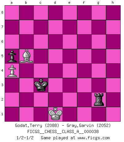 Last move : 1/2-1/2 2008 May 14 20:11:25 [Event "FICGS__CHESS__CLASS_A__000038"] [Site "FICGS"] [Date "2008.03.19"] [Round "1"] [White "Godat,Terry"] [Black "Gray,Garvin"] [Result "1/2-1/2"] [WhiteElo "2088"] [BlackElo "2052"] 1.d4 d5 2.c4 c6 3.Nc3 Nf6 4.Nf3 e6 5.Bg5 dxc4 6.e4 b5 7.e5 h6 8.Bh4 g5 9.Nxg5 hxg5 10.Bxg5 Nbd7 11.exf6 Bb7 12.g3 c5 13.d5 Nxf6 14.Bg2 Bh6 15.Bxf6 Qxf6 16.O-O O-O-O 17.Nxb5 a6 18.Nc3 exd5 19.Re1 Kb8 20.Na4 Rc8 21.Rb1 Rhd8 22.Qc2 Bg7 23.b4 cxb4 24.Rxb4 Rc7 25.Nb6 Ka7 26.Rd1 Qg6 27.Qxg6 fxg6 28.Nxc4 Bf8 29.Rxb7+ Rxb7 30.f4 Rc7 31.Ne5 Rd6 32.h4 Rc2 33.Kf1 Bg7 34.a4 Rc3 35.Kf2 d4 36.Be4 Bxe5 37.fxe5 Rb6 38.Rd2 Rc5 39.Rxd4 Rxe5 40.Ke3 Rf6 41.Rb4 a5 42.Rc4 Kb8 43.Kd4 Re8 44.Rc5 Rb6 45.Kd5 Rh8 46.Rc6 Rh5+ 47.Kd4 Rxc6 48.Bxc6 Kc7 49.Be8 Rh6 50.Kc5 g5 51.hxg5 Re6 52.Bb5 Re5+ 53.Kc4 Rxg5 54.g4 Rxg4+ 55.Kc3 Kd6 56.Kc2 Kc5 57.Kc3 Rg3+ 58.Kc2 Kd4 59.Kd2 Rg2+ 60.Kc1 Kc3 61.Kd1 Rb2 62.Ke1 Rh2 63.Kd1 Rg2 1/2-1/2 QGD Slav defense Kingside Castling by player White (move 16) Queenside Castling by player Black (move 16) 10 pieces endgame at move 47 : White KBPPP , Black KRRPP WHITE : King + 1 Bishop 3 Pawns BLACK : King + 2 Rooks 2 Pawns 9 pieces endgame at move 48 : White KBPPP , Black KRPP WHITE : King + 1 Bishop 3 Pawns BLACK : King + 1 Rook 2 Pawns 8 pieces endgame at move 51 : White KBPPP , Black KRP WHITE : King + 1 Bishop 3 Pawns BLACK : King + 1 Rook 1 Pawn 7 pieces endgame at move 53 : White KBPP , Black KRP WHITE : King + 1 Bishop 2 Pawns BLACK : King + 1 Rook 1 Pawn 6 pieces endgame at move 54 : White KBP , Black KRP WHITE : King + 1 Bishop 1 Pawn BLACK : King + 1 Rook 1 Pawn This chess game ended in a draw. Follow this game move after move (download)Chess makes man wiser and clear-sighted. (Vladimir Putin) Ich glaube, ich kenne inzwischen die Gründe für mein Versagen: schachliche Charakterfehler. Ich war nie ein Wunderkind und in meiner gesamten menschlichen Entwicklung immer zu langsam. (Viktor Kortschnoi) Fischer sacrificó virtualmente todo lo que la mayoría de nosotros los 'debiles' (término que él usa) valoramos, respetamos y apreciamos por el amor de un astuto, a menudo hermoso tablero de juego, por el privilegio ambivalente de ser su mas grande maestro. (Paul Kollar) Shah mat. Le roi est mort. Cri de fierté d'un joueur venant de terrasser son adversaire, courtoisement, sans effusion de sang. A good book on your shelf is a friend that turns its back on you and remains a friend. (Author unknown)