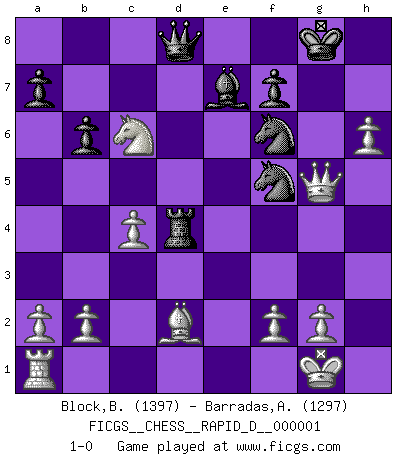Last move : 1-0 2008 April 3 19:56:54 [Event "FICGS__CHESS__RAPID_D__000001"] [Site "FICGS"] [Date "2008.03.19"] [Round "1"] [White "Block,Benjamin"] [Black "Barradas,Anderson"] [Result "1-0"] [WhiteElo "1397"] [BlackElo "1297"] 1.e4 c6 2.d4 d5 3.Nc3 dxe4 4.Nxe4 Bf5 5.Ng3 e6 6.Nxf5 exf5 7.Nf3 Nf6 8.Bd3 Bd6 9.O-O O-O 10.Bxf5 Re8 11.Re1 Rxe1+ 12.Qxe1 Nbd7 13.Bg5 Be7 14.c4 h6 15.Bf4 g5 16.Bd2 b6 17.h4 Nh5 18.Qe3 Ng7 19.Be4 Nf6 20.Bxc6 Rc8 21.hxg5 Rxc6 22.Ne5 Rd6 23.gxh6 Rxd4 24.Nc6 Nf5 25.Qg5+ 1-0 Caro-Kann : Classical variation Kingside Castling by player White (move 9) Kingside Castling by player Black (move 9) Player White won this chess game. Follow this game move after move (download)For surely of all the drugs in the world, Chess must be the most permanently pleasurable. (Assiac) Gewinnen beim Schach fördert das Selbstvertrauen. Beim Sex spüre ich sowas nicht... (Garry Kasparov) El Ajedrez se juega con la mente... ¡no con las manos!. (Renaud y Kahn) Les erreurs sont comme les malheurs, elles n'arrivent jamais seules. (Siegbert Tarrasch) If only faces could talk... (Pat Summerall, Sportscaster during the Super Bowl)