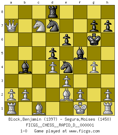 Last move : 1-0 2008 May 18 22:13:15 [Event "FICGS__CHESS__RAPID_D__000001"] [Site "FICGS"] [Date "2008.03.19"] [Round "1"] [White "Block,Benjamin"] [Black "Segura,Moises"] [Result "1-0"] [WhiteElo "1397"] [BlackElo "1450"] 1.Nf3 d5 2.d4 Bf5 3.c4 Nf6 4.e3 e6 5.Nc3 Nbd7 6.Qb3 Nb6 7.c5 Nbd7 8.Qxb7 Ne4 9.Nb5 Rb8 10.Nxc7+ Ke7 11.Qxa7 Kf6 12.Bb5 Ndxc5 13.Ne8+ Kg6 14.Ne5+ Kh5 15.Be2+ Kh6 16.Nxf7+ Kg6 17.Nxh8+ Kh6 18.Nf7+ Kg6 19.Nxd8 Rxd8 20.Nc7 Nd7 21.g4 Bb4+ 22.Kf1 1-0 This chess game has been lost on time (started : 2008.03.19 16:42:6) Reti Opening Player White won this chess game. Follow this game move after move (download)Many have become Chess Masters, no one has become the Master of Chess. (Siegbert Tarrasch) Wir können eben der zündenden Macht des Opfers nicht wiederstehen, denn die Begeisterung für das Opfer liegt in der Natur des Menschen. (Rudolf Spielmann) A la fecha, Fischer esta simplemente un nivel arriba de todos los mejores jugadores de Ajedrez del mundo. (John Jacobs) Aux échecs, les retours au sommet sont rares : les dommages psychologiques consécutifs à une défaite sont trop sévères. (Daily Telegraph) Memory is a way of holding onto the things you love, the things you are, the things you never want to lose. (from the television show: The Wonder Years)
