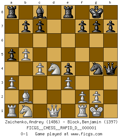 Last move : 0-1 2008 March 30 8:53:58 [Event "FICGS__CHESS__RAPID_D__000001"] [Site "FICGS"] [Date "2008.03.19"] [Round "1"] [White "Zaichenko,Andrey"] [Black "Block,Benjamin"] [Result "0-1"] [WhiteElo "1486"] [BlackElo "1397"] 1.b4 e5 2.a3 d5 3.Bb2 Bd6 4.e3 Nf6 5.c4 a5 6.b5 O-O 7.Be2 Nbd7 8.Nf3 e4 9.Nd4 dxc4 10.Bxc4 Re8 11.d3 Ne5 12.O-O Nxc4 13.dxc4 Bxh2+ 14.Kxh2 Ng4+ 15.Kg1 Qh4 0-1 Polish (Sokolsky) opening Kingside Castling by player Black (move 6) Kingside Castling by player White (move 12) Player Black won this chess game. Follow this game move after move (download)Castle early and often. (Rob Sillars) Garry Kasparov war erst in der Großmeister-Organisation GMA, dann in der Profischach-Vereinigung PCA, zum Schluss kehrte er wieder in den Schoß der FIDE zurück. Aber gut, manche Leute sind flexibel (Viswanathan Anand) Muchos jugadores de Ajedrez se sorprendían cuando después de la partida, Fischer explicaba con calma: 'Yo ya había analizado esta posibilidad' en una posición en la cual yo creía que no era posible de prever desde la apertura. (Mikhail Tal) RxDa4 pat (...) Without enthusiasm, virtue functions not at all, and vice only poorly. (Mignon McLaughlin, The Neurotic's Notebook, 1960)
