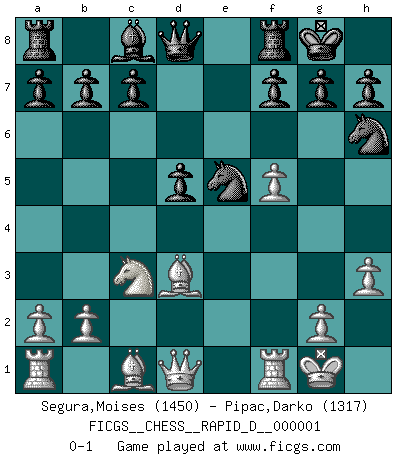 Last move : 0-1 2008 May 20 10:22:14 [Event "FICGS__CHESS__RAPID_D__000001"] [Site "FICGS"] [Date "2008.03.19"] [Round "1"] [White "Segura,Moises"] [Black "Pipac,Darko"] [Result "0-1"] [WhiteElo "1450"] [BlackElo "1317"] 1.e4 e5 2.d4 exd4 3.c3 dxc3 4.Nxc3 Bb4 5.Bd3 Nf6 6.Nge2 Nc6 7.O-O O-O 8.f4 Bxc3 9.Nxc3 d5 10.e5 Ng4 11.h3 Nh6 12.f5 Nxe5 0-1 This chess game has been lost on time (started : 2008.03.19 16:42:6) Danish gambit Kingside Castling by player White (move 7) Kingside Castling by player Black (move 7) Player Black won this chess game. Follow this game move after move (download)Personally, I rather look forward to a computer program winning the world Chess Championship. Humanity needs a lesson in humility. (Richard Dawkings) Der Partner hat auch seine Existenzberechtigung. (Savielly Grigorievitsch Tartakower) Alguna parte de un error es siempre correcto. (Savielly Tartakover) Les Echecs ont trois composantes : le temps, l'espace et le matériel en dernier. (Mikhail Tal) Wipe them out. All of them. (Darth Sidious in Star Wars ep.1)