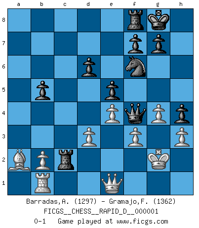 Last move : 0-1 2008 April 7 16:23:47 [Event "FICGS__CHESS__RAPID_D__000001"] [Site "FICGS"] [Date "2008.03.19"] [Round "1"] [White "Barradas,Anderson"] [Black "Gramajo,Francisco"] [Result "0-1"] [WhiteElo "1297"] [BlackElo "1362"] 1.e4 e5 2.Nf3 Nc6 3.Bc4 h6 4.O-O Bc5 5.d3 d6 6.Re1 Bg4 7.Be3 Bxe3 8.Rxe3 Nd4 9.Nbd2 Nxf3+ 10.Rxf3 Nf6 11.Qe2 c6 12.h3 Bxf3 13.Qxf3 b5 14.Bb3 O-O 15.c4 Qa5 16.cxb5 Qxd2 17.Rb1 cxb5 18.g4 Rac8 19.Qd1 Qf4 20.a4 a6 21.axb5 axb5 22.Kg2 h5 23.f3 h4 24.Qe1 Rc5 25.Ba2 Rc2+ 0-1 King's pawn game Kingside Castling by player White (move 4) Kingside Castling by player Black (move 14) Player Black won this chess game. Follow this game move after move (download)There are two classes of men; those who are content to yield to circumstances and who play whist; those who aim to control circumstances, and who play Chess. (Mortimer Collins) Du musst nicht gut spielen, es reicht, wenn du besser spielst als dein Gegner. (Anonymous) Todos los Maestros de Ajedrez fueron un día unos principiantes. (Chernev) Soyez une menace à chaque fois que vous vous asseyez pour jouer. (Ken Smith) Your best chance to get a Royal Flush in a casino is in the bathroom. (Anonymous)
