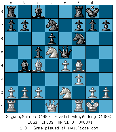 Last move : 1-0 2008 March 30 8:52:10 [Event "FICGS__CHESS__RAPID_D__000001"] [Site "FICGS"] [Date "2008.03.19"] [Round "1"] [White "Segura,Moises"] [Black "Zaichenko,Andrey"] [Result "1-0"] [WhiteElo "1450"] [BlackElo "1486"] 1.e4 e5 2.Bc4 Nf6 3.Nc3 Bc5 4.Nf3 d6 5.d4 exd4 6.Nxd4 Bb4 7.O-O O-O 8.f3 c5 9.Nde2 Qe7 10.Bg5 Nbd7 11.Nd5 Qe5 12.Bf4 1-0 Bishop's Opening : Berlin defense Kingside Castling by player White (move 7) Kingside Castling by player Black (move 7) Player White won this chess game. Follow this game move after move (download)Fischer prefers to enter Chess history alone. (Miguel Najdorf) Ich möchte Schüler heranbilden, die das Vermögen haben, selbst zu denken und Kritik zu üben. (Emanuel Lasker) Muchos jugadores de Ajedrez se sorprendían cuando después de la partida, Fischer explicaba con calma: 'Yo ya había analizado esta posibilidad' en una posición en la cual yo creía que no era posible de prever desde la apertura. (Mikhail Tal) Roi des jeux et jeu des rois, les échecs portent en eux un sentiment d'infini. Ils donnent à celui qui s'est efforcé d'en approfondir les arcanes l'impression de n'être pas à la mesure de l'homme; en fait, ils constituent un résumé de l'univers, un microcosme, et figurent cette grande échelle qui, dans les plans de la lumière descend jusqu'à la matière, qui des abîmes insondables remonte jusqu'en l'infini de Dieu. (Pyrame) There are two kinds of tragedy in this world, one is not getting what you want and the other is getting. (Lord of war)