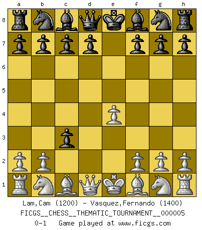 Last move : 0-1 2006 August 23 6:32:3 [Event "FICGS__CHESS__THEMATIC_TOURNAMENT__000005"] [Site "FICGS"] [Date "2006.07.09"] [Round "1"] [White "Lam,Cam"] [Black "Vasquez,Fernando"] [Result "0-1"] [WhiteElo "1200"] [BlackElo "1400"] 1.e4 e5 2.d4 exd4 3.c3 dxc3 0-1 This chess game has been lost on time (started : 2006.07.09 5:16:6) Danish gambit Player Black won this chess game. Follow this game move after move (download)The older I grow, the more I value Pawns. (Keres) Die meiste Zeit treffe ich auf Gegner, die meine Enkel sein könnten. Ich bin da, um ihnen zu zeigen, dass sie von mir noch einiges lernen können. (Viktor Kortschnoi) Con el tiempo, empecé a progresar en partidas decisivas. Tal vez porque me di cuenta de una simple verdad: no solo estaba yo nervioso sino también mi oponente. (Mikhail Tal) On a dit que l'homme se distingue de l'animal par le fait qu'il achète plus de livres qu'il ne peut en lire. Je voudrais suggérer qu'inclure à la liste des livres quelques livres d'échecs rendrait la distinction manifeste. (Edward Lasker) A good teacher is like a candle - it consumes itself to light the way for others. (Author unknown)