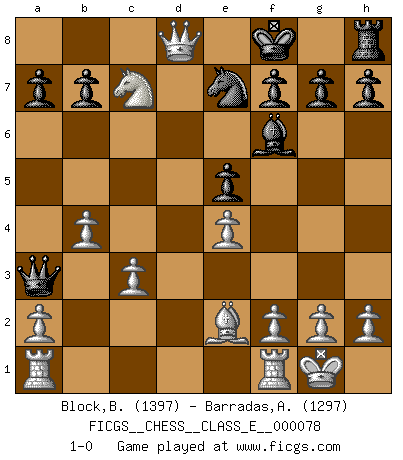 Last move : 1-0 2008 April 1 18:52:14 [Event "FICGS__CHESS__CLASS_E__000078"] [Site "FICGS"] [Date "2008.03.19"] [Round "1"] [White "Block,Benjamin"] [Black "Barradas,Anderson"] [Result "1-0"] [WhiteElo "1397"] [BlackElo "1297"] 1.e4 c5 2.Nf3 d6 3.d4 cxd4 4.Nxd4 Nc6 5.Nc3 Nf6 6.Bg5 e5 7.Ndb5 Be7 8.Bxf6 Bxf6 9.Nxd6+ Ke7 10.Nxc8+ Rxc8 11.Nd5+ Ke8 12.c3 Qa5 13.Be2 Rd8 14.O-O Ne7 15.b4 Qa3 16.Nc7+ Kf8 17.Qxd8+ 1-0 Sicilian Kingside Castling by player White (move 14) Player White won this chess game. Follow this game move after move (download)Not only will I predict his triumph over Botvinnik, but I'll go further and say that he'll probably be the greatest Chess player that ever lived. (John Collins) Das typische an einem Großmeister ist, daß er eine gewonnene Position schnell und schmerzlos gewinnt. (Irving Chernev) El Ajedrez era la lengua materna de Capablanca. (Reti) Il s'avisa de me proposer d'apprendre les échecs qu'il jouait un peu... me voilà forcené des échecs. J'achète un échiquier, je m'enferme dans ma chambre, j'y passe des jours et des nuits à vouloir apprendre par cur toutes les parties. (Jean-Jacques Rousseau, Confessions) Coffee just isn't my cup of tea. (Unknown)