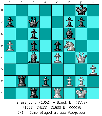 Last move : 0-1 2008 April 2 18:27:16 [Event "FICGS__CHESS__CLASS_E__000078"] [Site "FICGS"] [Date "2008.03.19"] [Round "1"] [White "Gramajo,Francisco"] [Black "Block,Benjamin"] [Result "0-1"] [WhiteElo "1362"] [BlackElo "1397"] 1.e4 c5 2.Bb5 Nc6 3.Nf3 d6 4.Bxc6+ bxc6 5.c4 Nf6 6.Nc3 e5 7.d3 Be7 8.h3 h6 9.O-O O-O 10.b3 Be6 11.a4 Rb8 12.Be3 Qc7 13.Qd2 Rxb3 14.a5 Rfb8 15.Ne1 d5 16.Nc2 d4 17.Bxh6 Rxc3 18.Bg5 Rb2 19.Rac1 Bxc4 20.Bxf6 Rxd3 21.Qe2 Bxf6 22.Qg4 Rc3 23.Rfe1 d3 24.Ne3 d2 25.Nf5 Rxc1 0-1 Sicilian defense Kingside Castling by player White (move 9) Kingside Castling by player Black (move 9) Player Black won this chess game. Follow this game move after move (download)In a gambit you give up a Pawn for the sake of getting a lost game. (Samuel Standige Boden) Fischer ist das größte Genie, das je vom Schachhimmel heruntergestiegen ist. (Mikhail Nekhemyevich Tal) El pensamiento metódico es mas útil en el Ajedrez que la inspiración. (C. J. S. Purdy) Demandez au pauvre Cg1 ce qu'il en pense. Eduard Gufeld à propos de la variante Saemisch de l'Est-Indienne. Memory is a crazy woman that hoards colored rags and throws away food. (Austin O'Malley)