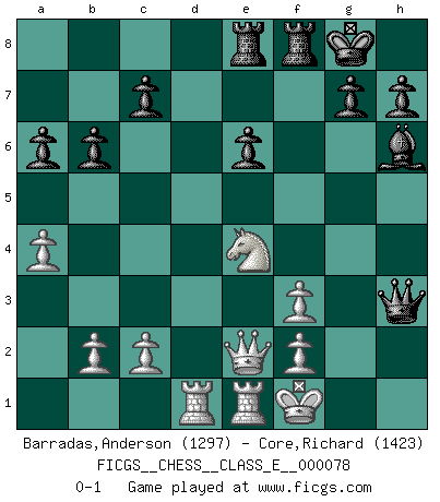 Last move : 0-1 2008 May 12 19:50:22 [Event "FICGS__CHESS__CLASS_E__000078"] [Site "FICGS"] [Date "2008.03.19"] [Round "1"] [White "Barradas,Anderson"] [Black "Core,Richard"] [Result "0-1"] [WhiteElo "1297"] [BlackElo "1423"] 1.e4 b6 2.d4 Bb7 3.Nc3 e6 4.d5 Bb4 5.a3 Bc5 6.Nf3 Nf6 7.Bg5 Be7 8.dxe6 fxe6 9.Bd3 Ng4 10.O-O Nxh2 11.Nxh2 Bxg5 12.Nf3 Bh6 13.Re1 Nc6 14.Bb5 O-O 15.Ne2 d5 16.Bxc6 Bxc6 17.exd5 Bxd5 18.Nc3 Qd6 19.Nb5 Qc5 20.a4 a6 21.Nc3 Bxf3 22.gxf3 Qg5+ 23.Kf1 Rad8 24.Qe2 Rde8 25.Ne4 Qf5 26.Rad1 Qh3+ 0-1 Owen defense Kingside Castling by player White (move 10) Kingside Castling by player Black (move 14) Player Black won this chess game. Follow this game move after move (download)No one ever won a game by resigning. (Unknown) Offensichtlich kennt Kasparow nichts anderes als Schach, und ich könnte 500 weitere Spieler dieser Sorte benennen. (Judith Polgar) Fischer deseaba darle a los Rusos una sopa de su propia medicina. (Larry Evans) Donnez-moi un Cavalier en 6e et je gagnerais toutes mes parties. (Steinitz) Always be a first-rate version of yourself, instead of a second-rate version of somebody else. (Judy Garland)