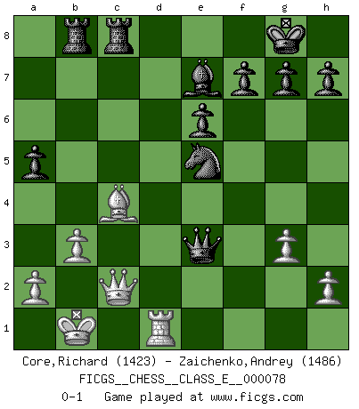 Last move : 0-1 2008 May 7 2:7:39 [Event "FICGS__CHESS__CLASS_E__000078"] [Site "FICGS"] [Date "2008.03.19"] [Round "1"] [White "Core,Richard"] [Black "Zaichenko,Andrey"] [Result "0-1"] [WhiteElo "1423"] [BlackElo "1486"] 1.Nf3 Nf6 2.c4 e6 3.d4 d5 4.c5 b6 5.Bg5 bxc5 6.Ne5 cxd4 7.Qxd4 c5 8.Qd3 Nbd7 9.Qb5 Be7 10.Qc6 Rb8 11.e3 O-O 12.Qa4 Nxe5 13.b3 Nfd7 14.f4 Ng6 15.Nc3 a6 16.Qa3 Ra8 17.Na4 Bxg5 18.Nxc5 Nxc5 19.Qxc5 Bf6 20.Rd1 Qe7 21.Qc2 Qb4+ 22.Kf2 d4 23.Bd3 dxe3+ 24.Kxe3 Qxf4+ 25.Ke2 Bb7 26.g3 Qf3+ 27.Kd2 Bg5+ 28.Kc3 Bf6+ 29.Kb4 a5+ 30.Ka3 Be7+ 31.Kb2 Qf6+ 32.Kb1 Bxh1 33.Rxh1 Qd4 34.Bc4 Ne5 35.Rd1 Qe3 36.Bb5 Rfc8 37.Bc4 Rab8 0-1 Reti Opening Kingside Castling by player Black (move 11) Player Black won this chess game. Follow this game move after move (download)I still hope to kill Fischer. (Boris Spassky) Die Arbeit ist etwas Unnatürliches. Die Faulheit allein ist göttlich. (Anatole France) Un Peón pasado aumenta su poder a medida de que el número de piezas en el tablero disminuye. (Capablanca) Botvinnik disait en comparant les échecs à la musique: Il existe une science dont le but est l'étude de l'acoustique et des sons. Mais il y a aussi un art qui se sert de l'océan des sons : c'est la musique. De toute évidence, il en est de même pour la pensée. La logique est l'étude des lois de la réflexion et les échecs reflètent, en tant qu'art, le côté logique de la réflexion, sous la forme d'images artistiques... Extrait de Fischer - Spassky, Reykjavik 1972 par Alexander & F. Wyndham (Ed. Solar), p 37. Some people are so afraid to die that they never begin to live. (Henry Van Dyke)