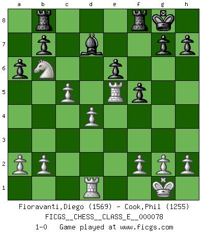 Last move : 1-0 2008 June 19 19:42:39 [Event "FICGS__CHESS__CLASS_E__000078"] [Site "FICGS"] [Date "2008.03.19"] [Round "1"] [White "Fioravanti,Diego"] [Black "Cook,Phil"] [Result "1-0"] [WhiteElo "1569"] [BlackElo "1255"] 1.Na3 d5 2.Nf3 a6 3.c4 Nf6 4.d4 e6 5.e3 Bb4+ 6.Bd2 Bxd2+ 7.Qxd2 Ne4 8.Qc2 O-O 9.Bd3 f6 10.Bxe4 dxe4 11.Qxe4 c5 12.O-O Qd6 13.Rad1 f5 14.Qe5 Qxe5 15.Nxe5 cxd4 16.exd4 Nd7 17.Rfe1 Nxe5 18.Rxe5 Bd7 19.c5 Rae8 20.Nc4 Rb8 21.Nb6 1-0 Durkin's attack Kingside Castling by player Black (move 8) Kingside Castling by player White (move 12) Player White won this chess game. Follow this game move after move (download)By this measure (on the gap between Fischer & his contemporaries), I consider him the greatest world champion. (Garry Kasparov) Wer mein Gambit spielt, muß bereit sein, alle Brücken hinter sich abzubrechen. Es verändert den ganzen Menschen. Es wirkt wie ein Zauberstab und fördert verkümmerte, gute Charakter- eigenschaften wieder zu Tage. (Emil Joseph Diemer) Todavía soy una víctima del Ajedrez. Tiene toda la belleza del arte y mucho mas. No puede ser comercializado. El Ajedrez es mas puro que el arte en su posición social. (Marcel Duchamp) Je crois qu'il existe des manières très spécifiques de jouer efficacement contre une machine. Evidemment, nous n'avons aucune chance en technique pure, parce que l'ordinateur calcule de manière parfaite. Mais lorsque nous faisons appel à notre cerveau, en utilisant l'intuition et la compréhension, alors nous restons beaucoup plus forts. (Anatoli Karpov) CHESS, n. f. [echecs, Fr.] A nice and abstruse game, in which two sets of puppets are moved in opposition to each other. (Dr Samuel Johnson, A Dictionary Of The English Language, 1755)