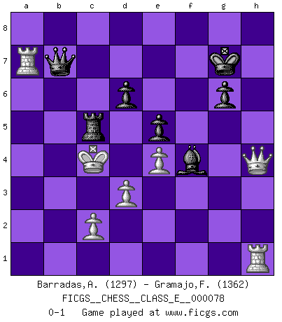 Last move : 0-1 2008 April 11 15:49:22 [Event "FICGS__CHESS__CLASS_E__000078"] [Site "FICGS"] [Date "2008.03.19"] [Round "1"] [White "Barradas,Anderson"] [Black "Gramajo,Francisco"] [Result "0-1"] [WhiteElo "1297"] [BlackElo "1362"] 1.e4 e5 2.Nf3 Nc6 3.Bb5 d6 4.O-O Bg4 5.d3 Nge7 6.Nc3 a6 7.Ba4 b5 8.Bb3 Nd4 9.h3 Bxf3 10.gxf3 Ng6 11.Bd5 Nf4 12.Bxf4 c6 13.Bxf7+ Kxf7 14.Bg3 Qf6 15.Kg2 h5 16.a4 h4 17.axb5 hxg3 18.fxg3 Qe6 19.bxa6 Qxh3+ 20.Kf2 Qh2+ 21.Ke3 g6 22.Ne2 Bh6+ 23.f4 Nxe2 24.Qxe2 Qxg3+ 25.Kd2 Bxf4+ 26.Kc3 Qg5 27.Qe3 Qd8 28.b4 Qc7 29.Ra5 Qc8 30.a7 c5 31.bxc5 Qc7 32.Kb4 Qb7+ 33.Kc4 Rhc8 34.Qh3 Kf6 35.Qh4+ Kg7 36.Rh1 Rxa7 37.Rxa7 Rxc5+ 0-1 Ruy Lopez : Old Steinitz defense Kingside Castling by player White (move 4) Player Black won this chess game. Follow this game move after move (download)You can only get good at Chess if you love the game. (Bobby Fischer) Ich kenne Menschen, die allen Willen der Welt besitzen und doch nicht Schach spielen können. (Robert James Fischer) Robert Fischer es la ley hacia si mismo. (Larry Evans) Comme les marins qui ont mille raisons différentes d'aller en mer, les joueurs d'échecs en ont tout autant avant de s'installer devant une table et jouer... (Vincent Bertignac, philosophe) The problem with manipulation is that people can turn on you. (Horatio Caine, C.S.I. Miami)