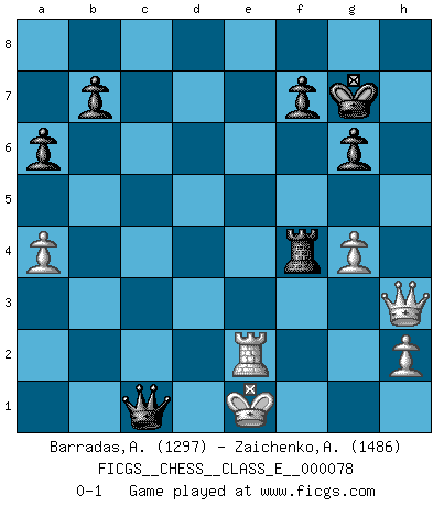Last move : 0-1 2008 May 5 20:10:20 [Event "FICGS__CHESS__CLASS_E__000078"] [Site "FICGS"] [Date "2008.03.19"] [Round "1"] [White "Barradas,Anderson"] [Black "Zaichenko,Andrey"] [Result "0-1"] [WhiteElo "1297"] [BlackElo "1486"] 1.e4 e5 2.Nf3 Nf6 3.Nxe5 d6 4.Nf3 Nxe4 5.d4 d5 6.Bd3 Nf6 7.O-O Be7 8.Re1 O-O 9.Nc3 Be6 10.Bg5 Nbd7 11.a3 c5 12.dxc5 Bxc5 13.Ne5 Bd4 14.Nxd7 Qxd7 15.Rb1 h6 16.Bxf6 Bxf6 17.Bb5 Qd6 18.Ne4 Qf4 19.Nxf6+ Qxf6 20.b3 a6 21.Bd3 Qg5 22.g3 h5 23.a4 h4 24.c4 Rac8 25.cxd5 Bxd5 26.Re3 h3 27.Be4 Bc6 28.Bxc6 Rxc6 29.Qd3 Rfc8 30.Rbe1 g6 31.Re8+ Rxe8 32.Rxe8+ Kg7 33.Qd4+ Rf6 34.f4 Qf5 35.Kf1 Qb1+ 36.Re1 Qxb3 37.g4 Qb6 38.Qc3 Qc6 39.Qxh3 Qc4+ 40.Re2 Rxf4+ 41.Ke1 Qc1+ 0-1 Petrov : Classical attack Kingside Castling by player White (move 7) Kingside Castling by player Black (move 8) Player Black won this chess game. Follow this game move after move (download)Chess is life. (Bobby Fischer) Wenn Schach ein enormer Dschungel ist, der seine Myriaden von Geheimnissen nicht preisgeben will, dann sind Computer die Kettensägen einer gewaltigen ökologisch unsensiblen Nutzholzfirma. (Nigel Short) Yo nunca en mi vida he jugado la Defensa Francesa, que viene siendo la más aburrida de todas las Aperturas. (Wilhelm Steinitz) Shah mat. Le roi est mort. Cri de fierté d'un joueur venant de terrasser son adversaire, courtoisement, sans effusion de sang. Nowadays, anyone who cannot speak English and is incapable of using the Internet is regarded as backward. (Al-Waleed bin Talal)