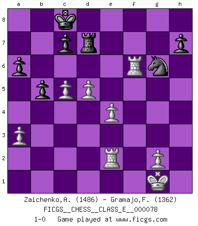 Last move : 1-0 2008 April 21 18:57:32 [Event "FICGS__CHESS__CLASS_E__000078"] [Site "FICGS"] [Date "2008.03.19"] [Round "1"] [White "Zaichenko,Andrey"] [Black "Gramajo,Francisco"] [Result "1-0"] [WhiteElo "1486"] [BlackElo "1362"] 1.b4 Nf6 2.Bb2 Nd5 3.a3 d6 4.e3 e5 5.c4 Nf6 6.Be2 Ne4 7.d3 Nf6 8.Nd2 g6 9.Ngf3 Bf5 10.e4 Be6 11.O-O Bg7 12.Ng5 Qe7 13.Nxe6 Qxe6 14.Nf3 b6 15.Ng5 Qe7 16.f4 Nbd7 17.fxe5 Nxe5 18.Qd2 O-O-O 19.d4 Nc6 20.Bf3 Bh6 21.Rfe1 Rd7 22.h4 a6 23.Qe2 Bxg5 24.hxg5 Nh5 25.Bxh5 gxh5 26.Qxh5 f6 27.gxf6 Qxf6 28.Re2 Ne7 29.d5 Qg6 30.Qxg6 Nxg6 31.Bxh8 Nxh8 32.Rf1 Ng6 33.c5 dxc5 34.bxc5 b5 35.Rf6 1-0 Polish (Sokolsky) opening Kingside Castling by player White (move 11) Queenside Castling by player Black (move 18) Player White won this chess game. Follow this game move after move (download)What is the difference between chess and football? Everybody understands football, but nobody plays it. Everybody plays chess, but nobody understands it. Everything is relative. (Vladimir Kramnik) Wenn Capablanka heute auf der Schachbühne erscheinen würde, hätte er ein halbes Jahr gebraucht um sich die Schachtheorie anzueignen. Und dann hätte er alles und jeden besiegt. (Mikhail Moiseyevich Botvinik) No puedes jugar al Ajedrez si eres de corazón noble. (Proverbio Francés) Roi des jeux et jeu des rois, les échecs portent en eux un sentiment d'infini. Ils donnent à celui qui s'est efforcé d'en approfondir les arcanes l'impression de n'être pas à la mesure de l'homme; en fait, ils constituent un résumé de l'univers, un microcosme, et figurent cette grande échelle qui, dans les plans de la lumière descend jusqu'à la matière, qui des abîmes insondables remonte jusqu'en l'infini de Dieu. (Pyrame) We cannot be sure of having something to live for unless we are willing to die for it. (Ernesto Che Guevara)