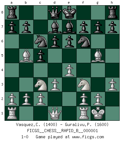 Last move : 1-0 2006 April 22 18:54:44 [Event "FICGS__CHESS__RAPID_B__000001"] [Site "FICGS"] [Date "2006.04.14"] [Round "1"] [White "Vasquez,Carlos"] [Black "Guralivu,Paul-Iosif"] [Result "1-0"] [WhiteElo "1400"] [BlackElo "1600"] 1.e4 c5 2.Nf3 Nc6 3.Bb5 d6 4.O-O Bd7 5.d3 e6 6.Nc3 Nf6 7.Bg5 Be7 8.h3 1-0 Sicilian : Nimzovich-Rossolimo attack (without ...d6) Kingside Castling by player White (move 4) Player White won this chess game. Follow this game move after move (download)One doesn't have to play well, it's enough to play better than your opponent. (Siegbert Tarrasch) Bis zum Jahr 1971 verlief in meiner Schachkariere alles glatt. Dieses dramatische Match [Fischer-Taimanov 6:0] machte mein Leben zur Hölle. (Mark Taimanov) El juego del Ajedrez no es solamente una diversión quieta; algunas cualidades muy valuables de la mente se pueden adquirir y cultivar con el, como convertirlos en habitos disponibles para toda ocasión; ya que la vida es algo así como el Ajedrez. (Benjamin Franklin) Votre seul travail dans les ouvertures est d'obtenir un milieu de partie jouable. (Lajos Portish) There are two major products that came out of Berkeley: LSD and UNIX. We do not believe this is to be a coincidence. (Jeremy S. Anderson)