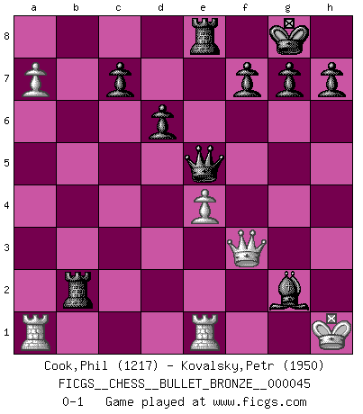 Last move : 0-1 2008 August 30 22:1:16 [Event "FICGS__CHESS__BULLET_BRONZE__000045"] [Site "FICGS"] [Date "2008.08.30"] [Round "1"] [White "Cook,Phil"] [Black "Kovalsky,Petr"] [Result "0-1"] [WhiteElo "1217"] [BlackElo "1950"] 1.e4 e5 2.Nf3 Nc6 3.Bc4 Bc5 4.O-O Nf6 5.Nxe5 Nxe5 6.d4 Nxc4 7.dxc5 Qe7 8.f3 Qxc5+ 9.Kh1 d6 10.Nc3 O-O 11.Re1 Be6 12.b3 Ne5 13.Bb2 Rfe8 14.Na4 Qf2 15.Bd4 Qh4 16.c4 Rad8 17.Qd2 a6 18.Bf2 Qh5 19.Nc3 b5 20.cxb5 axb5 21.Nxb5 Neg4 22.fxg4 Nxg4 23.Qf4 Qxb5 24.h3 Nxf2+ 25.Qxf2 Qe5 26.a4 Rb8 27.a5 Rxb3 28.a6 Bxh3 29.a7 Rb2 30.Qf3 Bxg2+ 0-1 Giuoco Piano Kingside Castling by player White (move 4) Kingside Castling by player Black (move 10) Player Black won this chess game. Follow this game move after move (download)Fischer is an American Chess tragedy on par with Morphy and Pillsbury. (Mig Greengard) Was ist der Unterschied zwischen einem Strassenarbeiter und einem Schachspieler? --Der Schachspieler bewegt sich ab und zu. (Anonymous) El Jaque al descubierto es el bombardero del tablero. (Reuben Fine) Un journaliste : 'Vous préférez avoir une dame de plus sur l'échiquier ou au lit ?' Boris Spassky : 'Ca dépend de la position.' Somehow our devils are never quite what we expect when we meet them face to face. (Nelson DeMille)