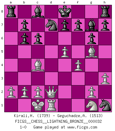 Last move : 1-0 2008 August 16 21:27:38 [Event "FICGS__CHESS__LIGHTNING_BRONZE__000032"] [Site "FICGS"] [Date "2008.08.16"] [Round "1"] [White "Kirali,Hasan"] [Black "Geguchadze,Alexander"] [Result "1-0"] [WhiteElo "1739"] [BlackElo "1513"] 1.e4 d6 2.d4 Nf6 3.Nc3 g6 4.Bg5 Bg7 5.Qd2 Nbd7 6.O-O-O c6 7.e5 dxe5 8.dxe5 Ng4 9.f4 Qb6 10.h3 Nf2 11.Na4 Nxh1 12.Nxb6 axb6 13.Bc4 1-0 Pirc : Byrne variation Queenside Castling by player White (move 6) Player White won this chess game. Follow this game move after move (download)The mistakes are there, waiting to be made. (Savielly Tartakower) Frage des Reporters: -Worin besteht das Ziel von Gambiteröffnungen? Antwort: -Auf Kosten der Partie einen Ruf als Angriffspieler zu erwerben.- (Siegbert Tarrasch) Cuando tengo las piezas blancas, yo gano porque soy blanco; Cuando tengo las piezas negras, yo gano porque soy Bogolyubov. (Bogolyubov) Les échecs, c'est la lutte contre l'erreur. (Johannes Zukertort) If you are good, you will be assigned all the work. If you are really good, you will get out of it. (Dan Rotaru)