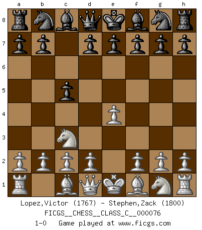 Last move : 1-0 2008 June 9 11:55:17 [Event "FICGS__CHESS__CLASS_C__000076"] [Site "FICGS"] [Date "2008.03.20"] [Round "1"] [White "Lopez,Victor"] [Black "Stephen,Zack"] [Result "1-0"] [WhiteElo "1767"] [BlackElo "1800"] 1.e4 c5 2.Nc3 1-0 This chess game has been lost on time (started : 2008.03.20 17:55:31) Sicilian : Closed Player White won this chess game. Follow this game move after move (download)Discovered check is the dive bomber of the Chessboard. (Reuben Fine) Wenn Spassky eine Figur opfert kannst du genauso gut aufgeben. Aber wenn Tal eine Figur opfert, spiel weiter. Er könnte noch eine weitere opfern, und dann ... wer weiß? (Miguel Najdorf) Nunca antes ha habido un jugador de Ajedrez con tal conocimiento a fondo de las complejidades del juego y una inmensa voluntad absolutamente indomable de ganar. Yo pienso que Fischer es el jugador mas grande que jamás haya existido. (Lisa Lane) Même un GMI sait rarement calculer sur plus de cinq coups une attaque à sacrifices. (Rudolf Spielmann) Logic : The art of thinking and reasoning in strict accordance with the limitations and incapacities of the human misunderstanding. (Ambrose Bierce)